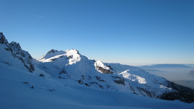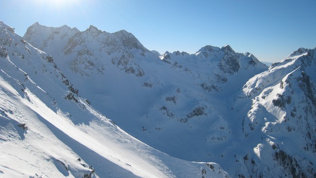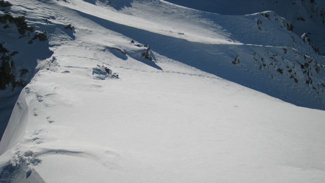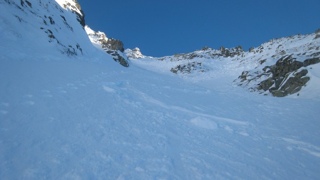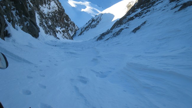 Les couloirs sont en bonnes conditions, poudre dense par endroit et croûte parfois. Des zones sont en béton. Bref la neige est changeante.
