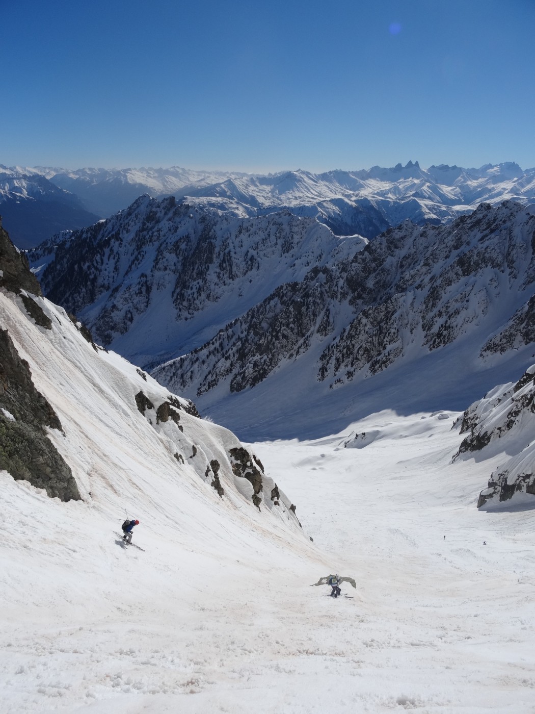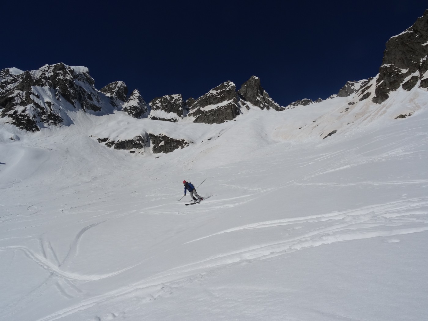 Conditions de ski correctes entre 2600 et 1800 m, médiocre plus bas. Un peu de monde (une dizaine ?) ce jour mais bien réparti. Croisé deux personnes en haut qui sortaient du couloir ouest et qui enchainaient ensuite sur le Charnier (ouest).