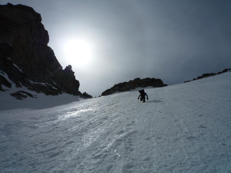 Dans le couloir nord-ouest, la glace était présente en haut au centre, sous une croute et 15cm de neige plus froide. Prudence à la montée, descente rive gauche pour éviter cette zone.
