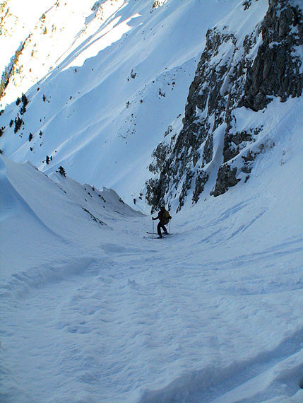 Entrée de la rampe N, couloir court (45°/ 100) qui permet de rejoindre le versant NW de la Lanche (Crête Arlicots/Parra) et ses belles pentes froides. (Cot. proposée : 4.2/AD/E2)