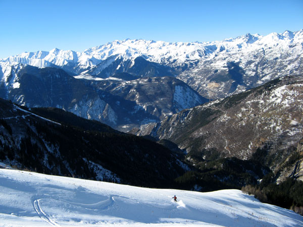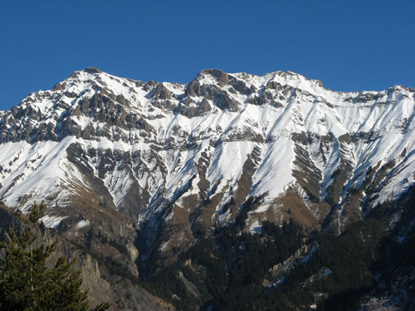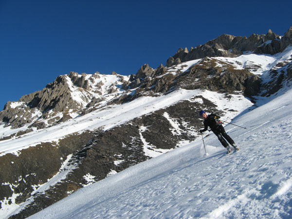 Cette face sauvage et haut perché avait attirée mon attention. A notre arrivée, le manque de neige en met un coup au moral, mais quand on aime on compte pas, faut s'entrainer au portage pour les années à venir ;o) La neige se présente bien puis au dessus des barres, l'expo est forte, des gobelets présents et une couche de neige dure nous font abdiquer : si cette couche dure casse, il y a de la largeur, à peu près 60cm de neige et un saut de barre, non merci ! Je retrouve un peu les gobelets du 6 janvier de ma sortie à Crêt Lognan (exposé NW contre W ici), c'est pourquoi dans ce secteur des Encombres Sud, je recommande la plus grande prudence, tout au moins en exposition N, S, W au dessus de 2200 m ! Car ces gobelets ne sont pas près de partir d'ici ...?!? (si un expert veux bien développer ?) D+ 1000m, 470m skié, le gros but des familles...