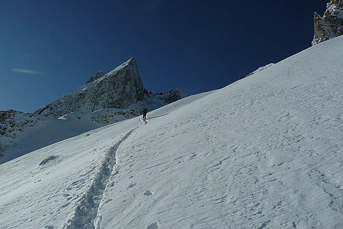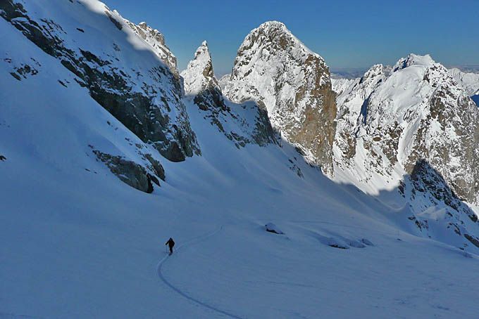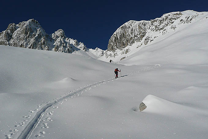Pour cette reprise, les exigences étaient les suivantes : de la poudre, éviter la surfréquentation, être au soleil. Réussite totale et une qualité de neige même au-delà de nos espérances bien que connaissant la capacité de la Lauzière à recevoir la neige et à la protéger du vent. J'en profite pour remercier à nouveau doublement nos trois prédécesseurs (seuls âmes rencontrées dans le vallon) et particulièrement le conducteur de leur véhicule : pour avoir sorti avec la corde notre bagnole plantée bêtement dans la neige et pour avoir tracé l'essentiel de la montée.