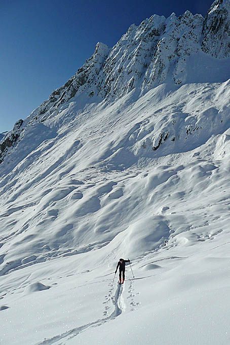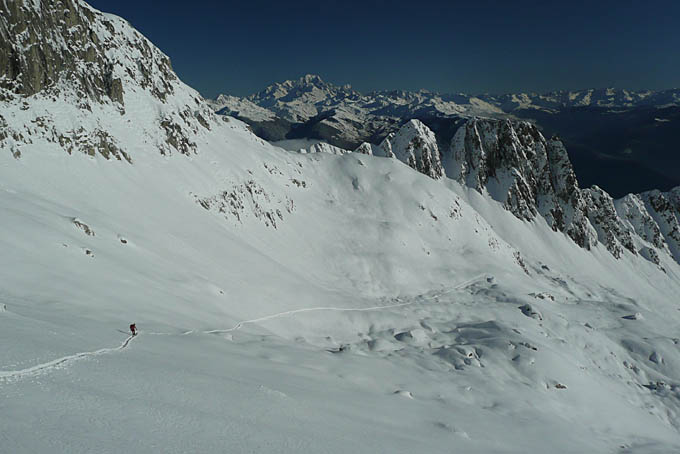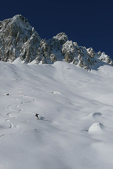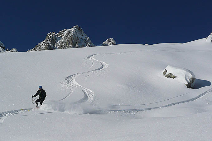 Conditions excellentes pour la date, de la poudre de partout, commençant à peine à s'alourdir en ESE sous 2000 m et à peine densifiée par le vent à l'approche des crêtes. Pas une seule touchette ni pour moi, ni pour mon compagnon.