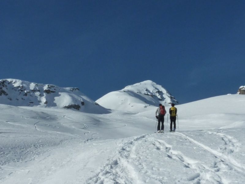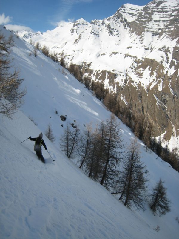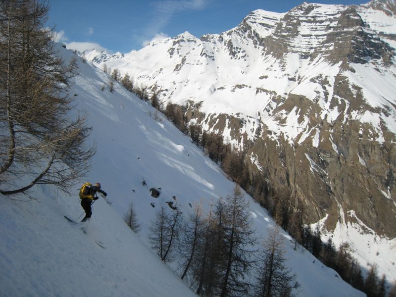 L'arête nord du grand Pinier est bien trafollée gelée par endroit tandis que la face nord offre une belle croûte! Plus bas c'est meilleur à l'abri des mélèzes.