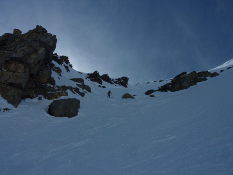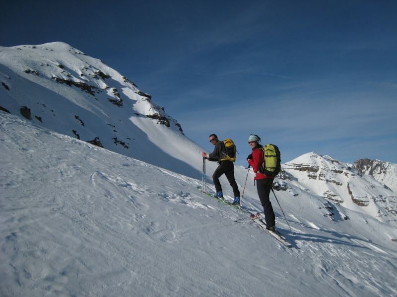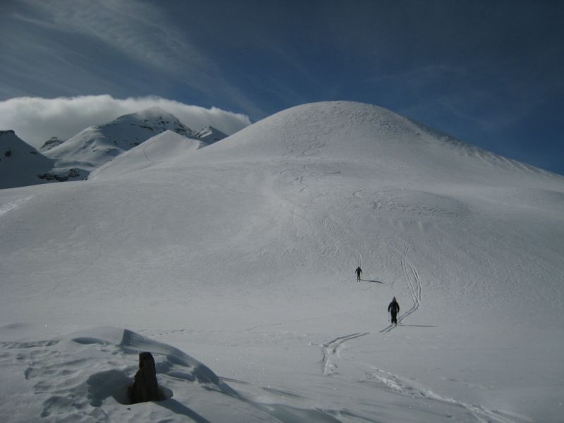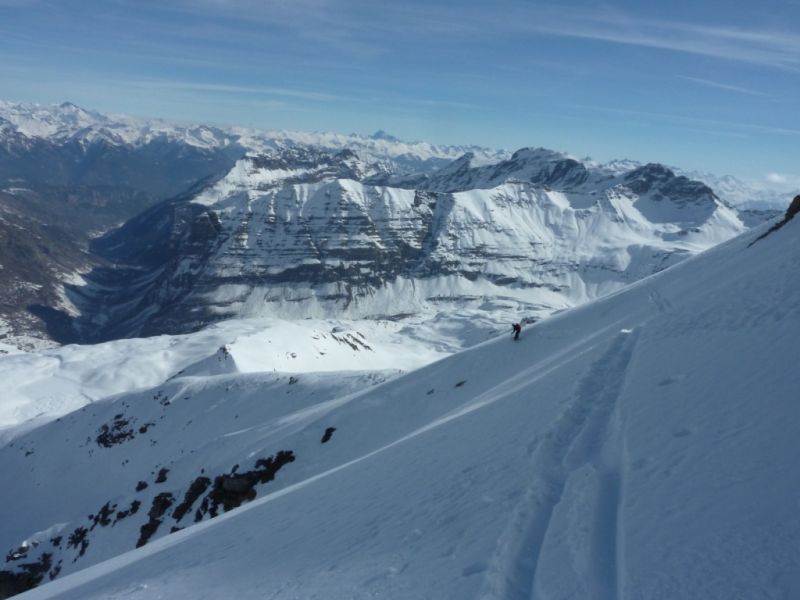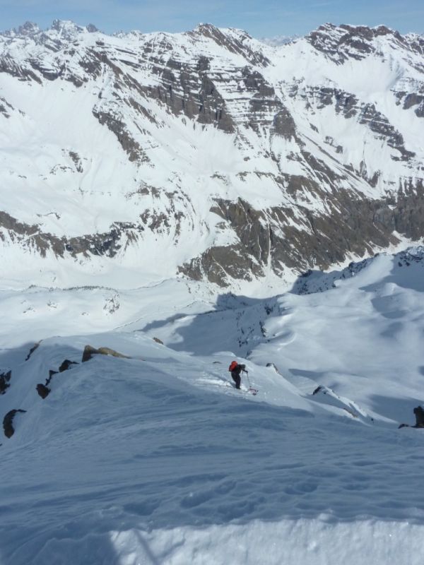 H10 mais après 300m de descente dans la face nord nous nous sommes échappés vers 2700 m vers le col sur l'arête nord au sud de Serre-Eyraud étant donné la maigre qualité de la neige. Guère mieux jusqu'au lac de Palluel puis remontée à la tete des Arindoux pour espérer trouver de la poudre en versant nord. A peu près gagné sauf que dans les trouées d'avalanches, on sent bien les boules!