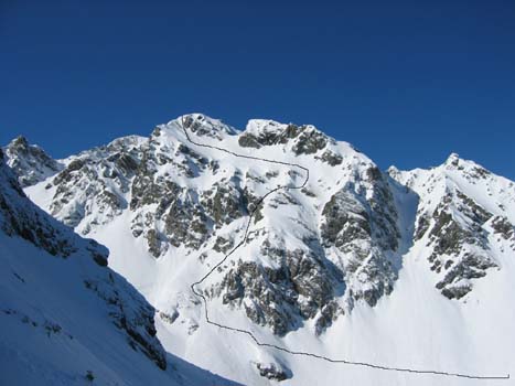Remonter au lac de crop, aller sud franchement au delà du lac et attaquer par une oblique montante de gauche à droite (couloir),aller au sommet du couloir pour franchir une petite brèche enneigée.Au delà de la breche on rejoint en montant une zone concave praticable facilement en peaux et le sommet...