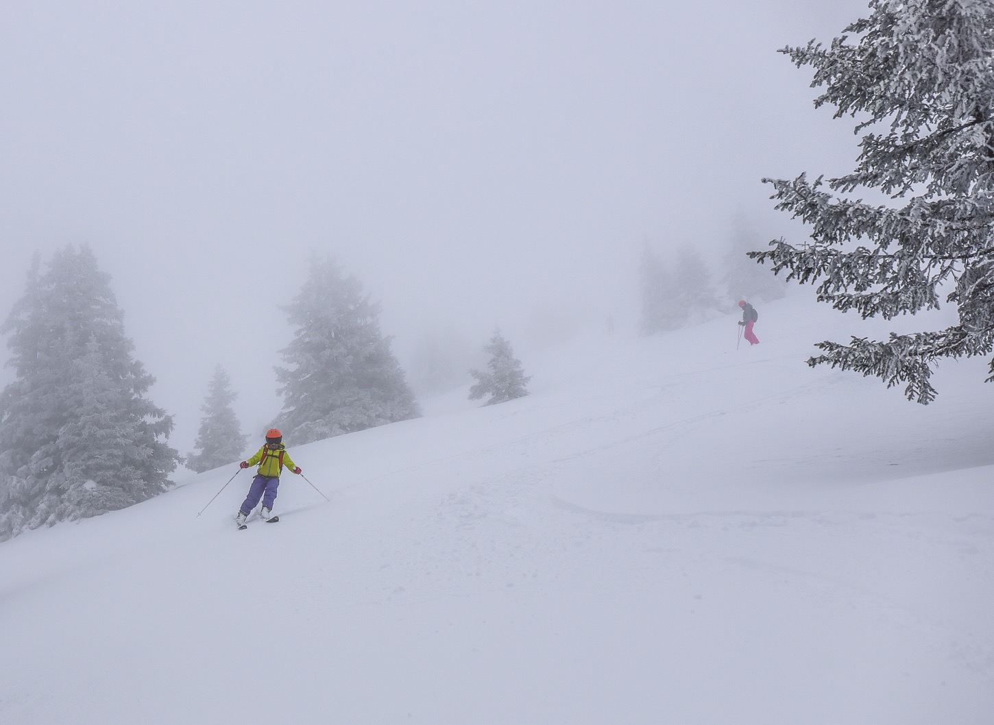 On ne se lasse pas de cette classique dans ces conditions. La partie basse, sous le grand plateau, est globalement damée comme une piste si on suit le chemin principal. La partie haute permet de goûter l'excellente poudreuse avec encore largement de quoi faire sa trace. 50 derniers mètres soufflés un peu plus irréguliers et souvent portants mais toujours facile à skier.