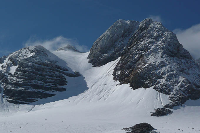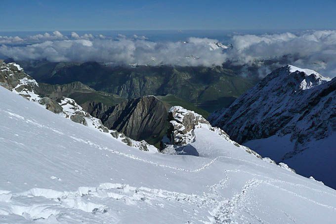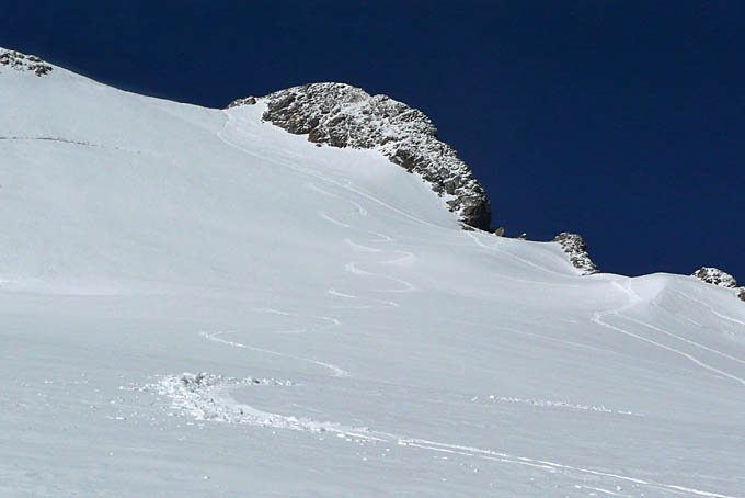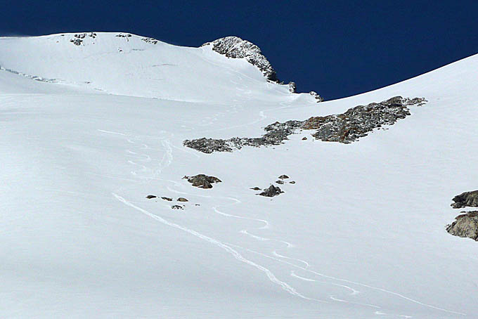 Peu de neige récente mais méfiance quand même dans la pente terminale de l'Etendard très ventée. Dans les conversions, on voit qu'il y a de la cohésion. Il m'est déjà arrivé une fois à l'automne de faire partir tout le haut de la face sur seulement 10 cm. Alors j'ai évité de tirer de trop larges bords.
