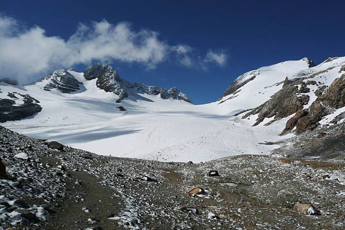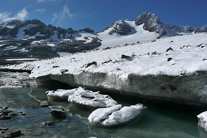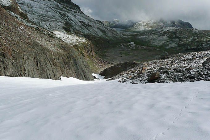 A la descente, on skie le glacier, on remonte 30 mètres au sec puis on skie un bout de névé, on descend 50 m à pied et on skie la gorge du torrent jusqu'à l'entrée du replat du lac Tournant. Ce n'est pas si mal vu la date. De toutes façons, le reste est plat.