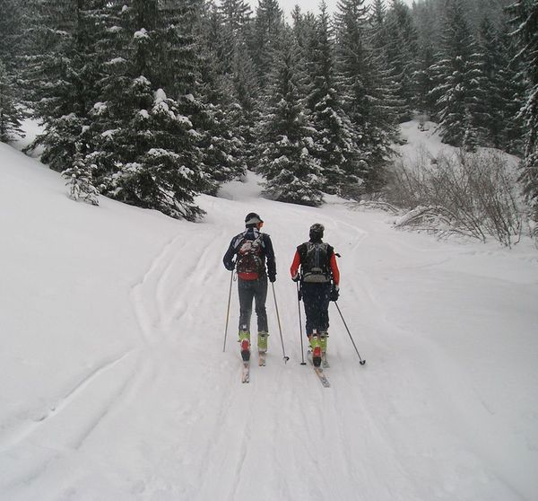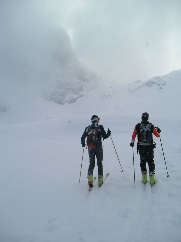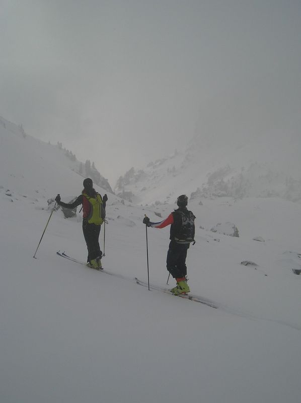 Malgré le temps bouché il a très peu neigé : 5 à 7 cm. Le tout repose sur un fond crouteux enfonçant plus ou moins ou sur une neige dure très favorable aux "zippages" intempestifs. Bons passages sous la brèche sud des Roberts au retour.