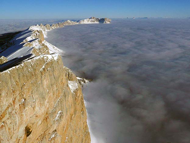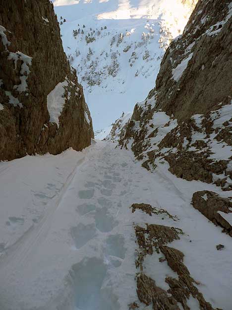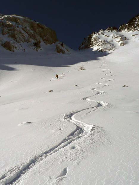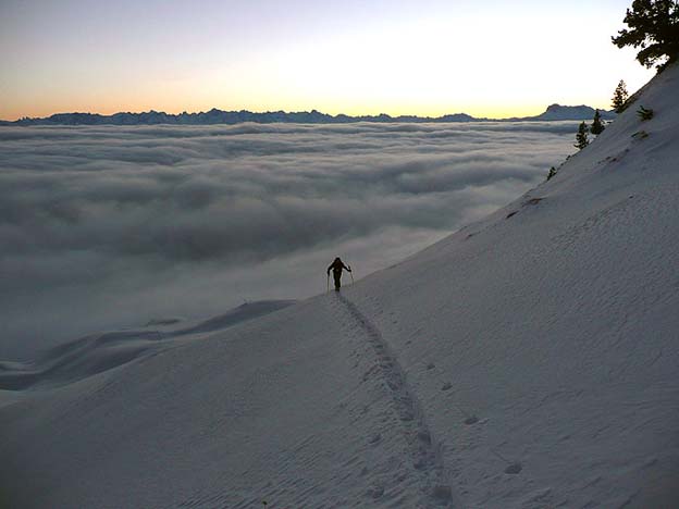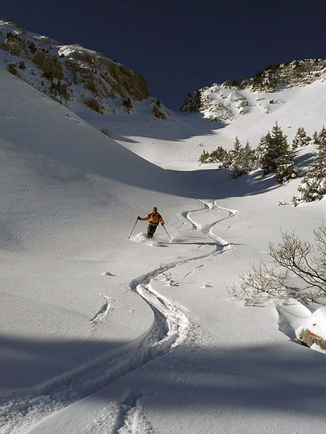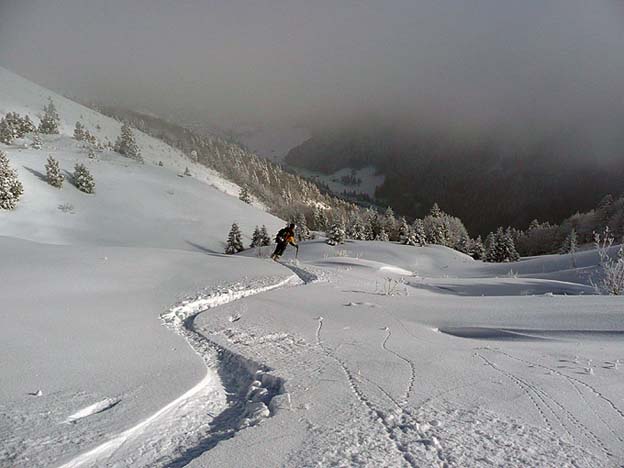 Très grosse poudre jusqu'à 100 m sous le pas de la Ville où à nouveau l'enneigement diminue peu à peu. Face nord Veymont insuffisamment enneigée pour être skiée mais passe bien à la montée avec qq déchaussages. Face ouest : neige soufflée peu épaisse en haut sans sous-couche (on se fait léger et on touche régulièrement) puis on ne touche plus sous 2100.