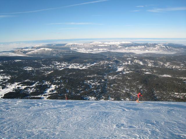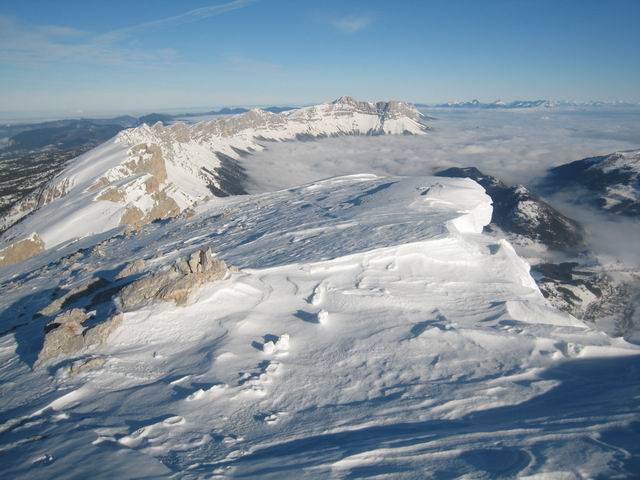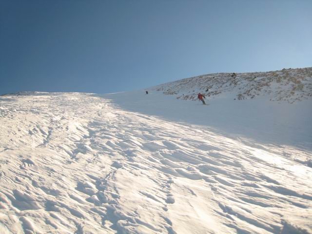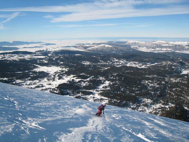 Dans les zones ou la neige n'a pas été travaillée, on trouve de la poudre dense recouverte de 10 à 15cm de poudre plus légère, sans doute celle tombée samedi. Quelques zones cirées en Ouest, à éviter donc, ainsi que dans le haut du passage de la barre ou ne subsite qu'une bande étroite ou l'accorche reste correcte.
