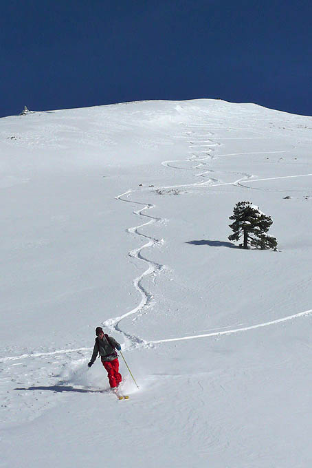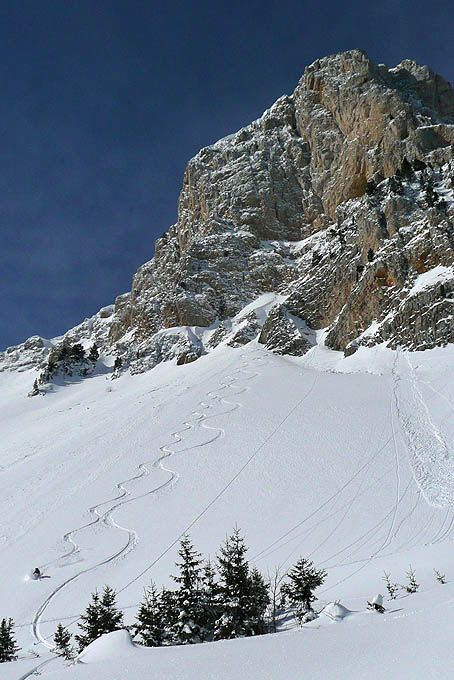 Une journée qui commençait mal. Partis pour un circuit dans le Jocou, on s'équipe puis on se ravise car le ciel est complètement bâché sur Lus. Direction le Veymont que l'on a vu au soleil. Dans la descente du col, une plaque de verglas traîtresse envoie le véhicule contre la glissière (sans glissière, c'était le grand saut !). Plus de peur que de mal, ça roule encore et en plus, le véhicule devait partir à la casse dans un mois. Pour le reste, du très bon ski encore à Gresse moyennant un difficile passage dans le couloir de l'avion. Probablement - 20°C + l'effet vent tempétueux. La montée et la descente avec toutes les couches et complètement congelés. Le reste fut plus humain.