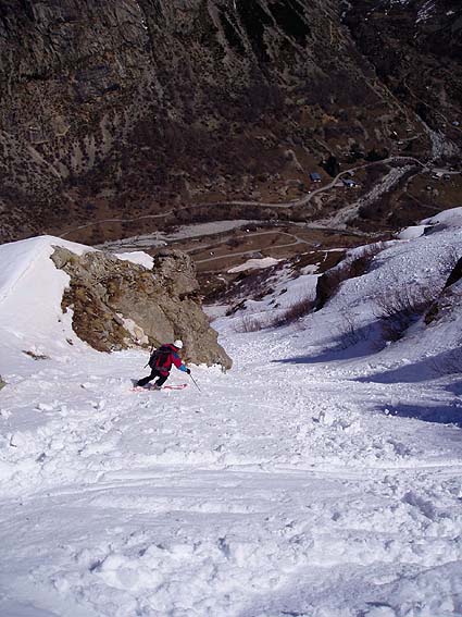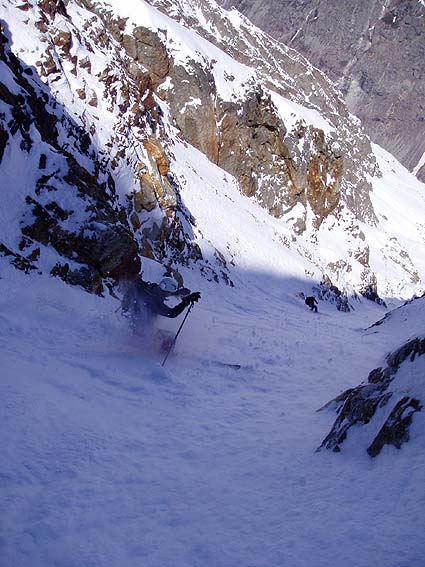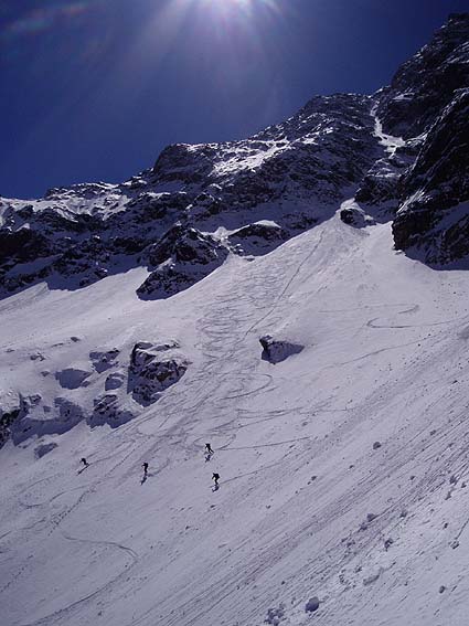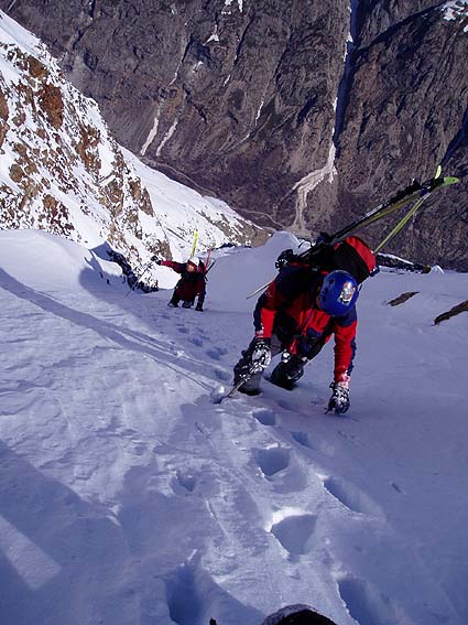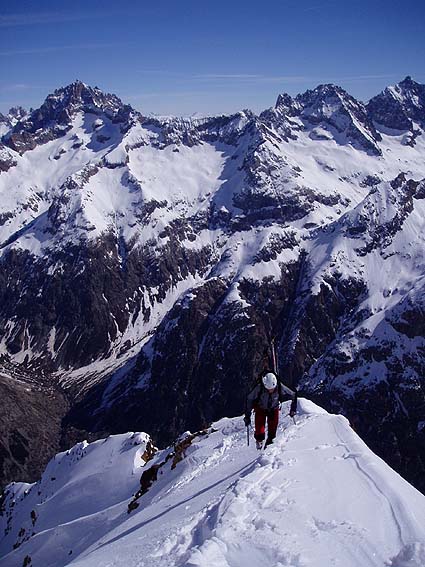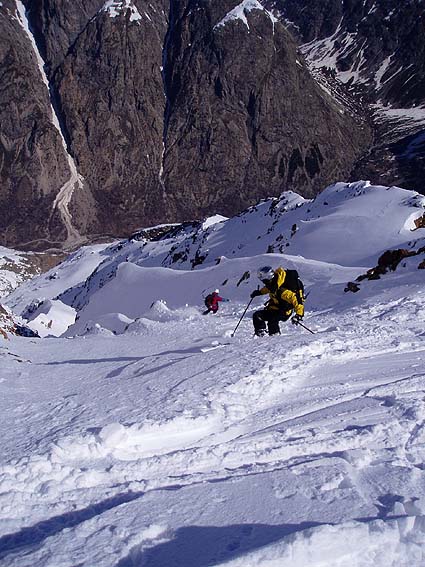 Quelle course ! 1700m de souffrance à la montée en crampons pour une face splendide. Malgré le départ "nocturne" (30' à la frontale), nous avons trouvé le meilleur passage qui soit dans les barres inférieures. il n'y a aucun problème, la pente ne dépasse jamais le 40° ou sur de très courtes sections et tout se skie très bien (notre repérage en février suite au but à la Gandolière à bien payé). Ensuite, trace fatiguante avec heureusement de nombreux relais. Petit ressaut glacé vers 3200m mais qui passe bien à la descente avec un "tout droit". La pente n'est jamais très raide (100m à un petit 50° en tout et 45°/700) mais l'ampleur est là. Du très grand ski face au Soreiller, à la Meije et tutti quanti. L'enneigement est cependant étonnament faible comparé à Belledonne en-dessous de 2000m. Limite ski vers 1800 en nord raide, portage jusqu'à la passerelle de Bonnepierre ou jusqu'au plan du C