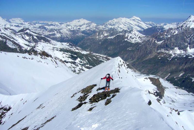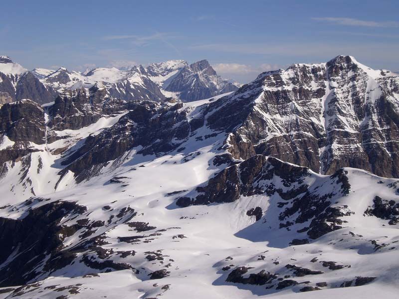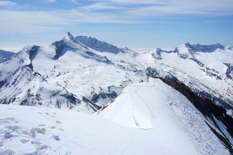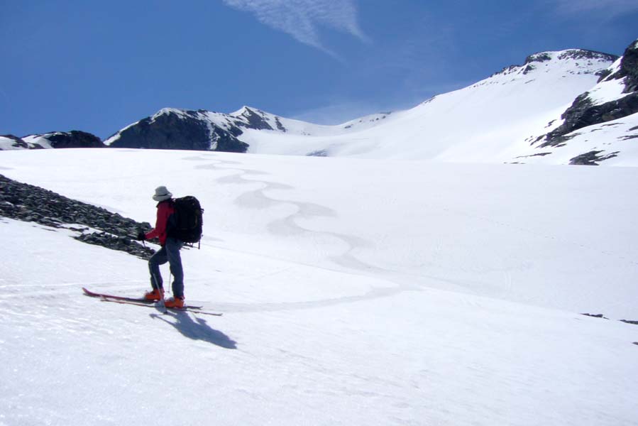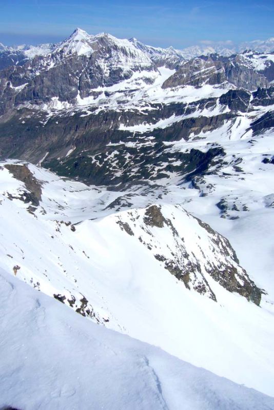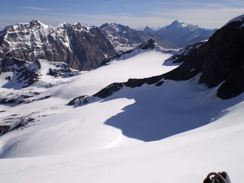 Neige excellente de haut en bas en descendant à 11h. Seule une courte portion de croûte qui lâche vers 3200 entre les crevasses. Trois skieurs à la Galise, un quart d'heure de portage, dont deux qui ont ajouté le versant ouest du Grand Cocor, le tout excellent. Quatre Italiens au sommet, dont trois s'apprêtaient à descendre la nord-est (pas de confirmation). Un autre skieur derrière nous. Neige parfaite pour la montée tout en peaux, couteaux pour l'ascension du col et la fin.