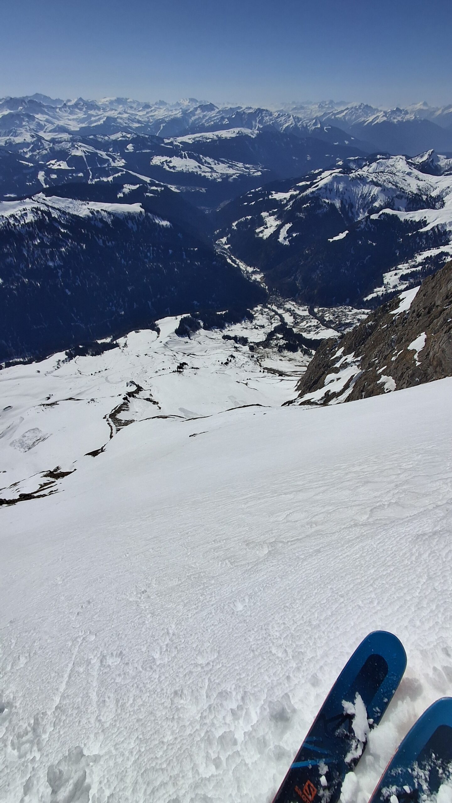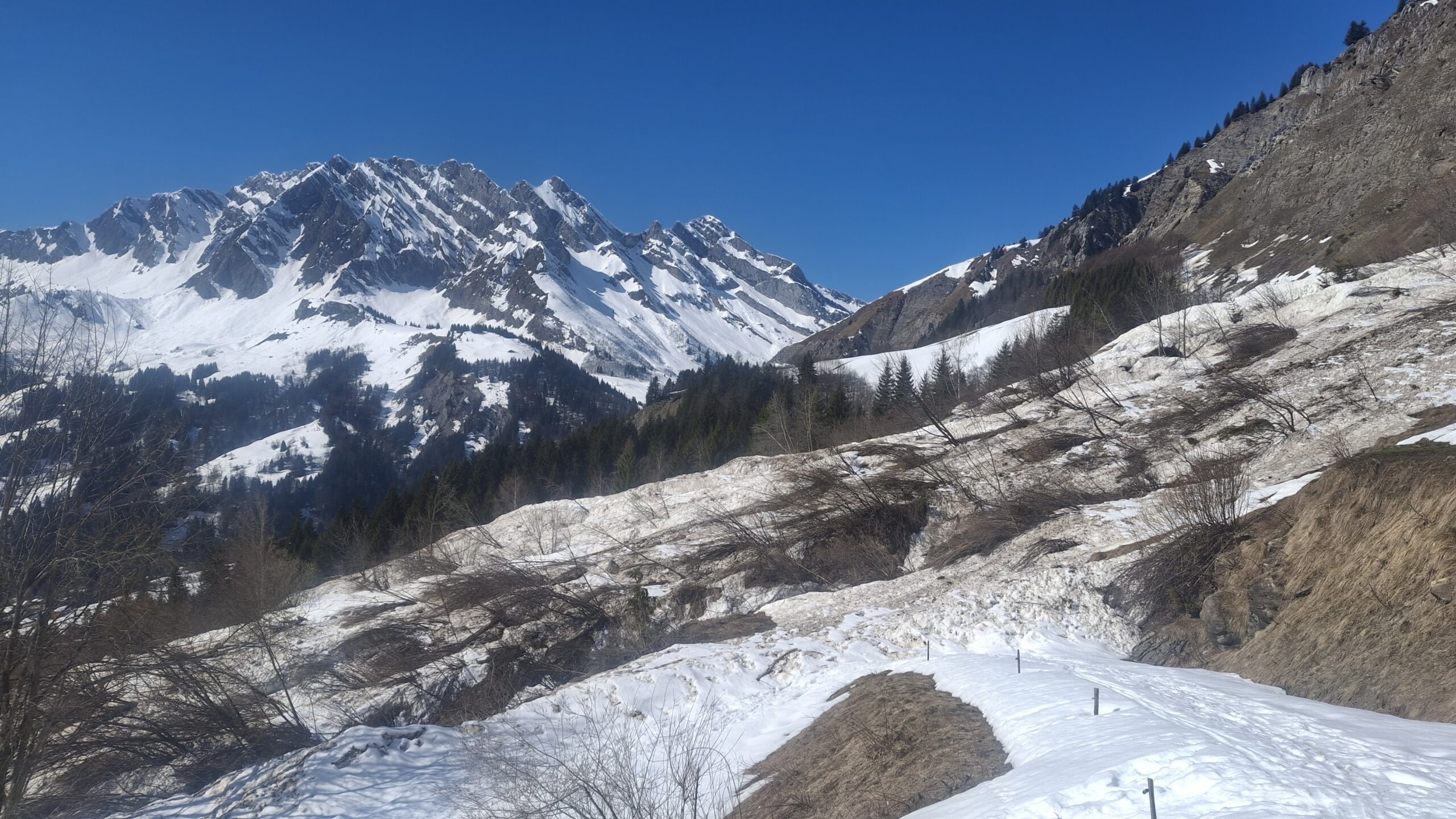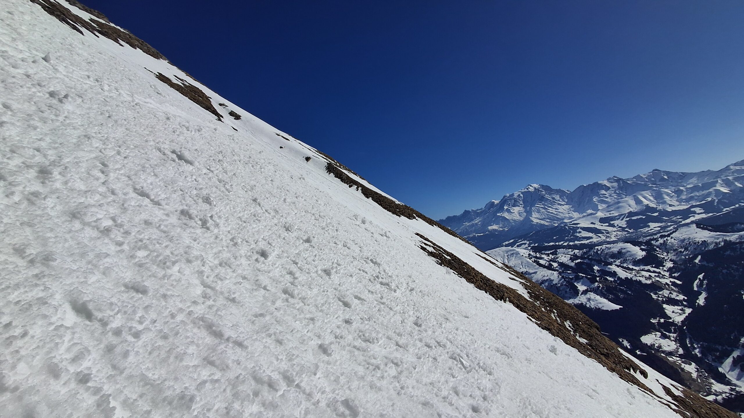 Voyage dans les pentes suspendues du versant Sud des Aravis. Le regel du jour est très bon avec même un petit air. La diagonale est l'un des rares itinéraires qui paraît continu sur la webcam de la Torraz Hormis quelques discontinuités sur le chemin du bas et les deux belles coulées, c'est un billard de haut en bas. Attaque de la descente à 10h45
