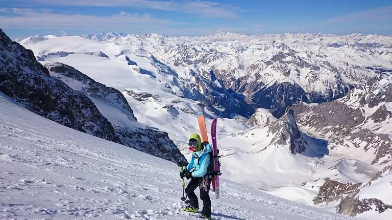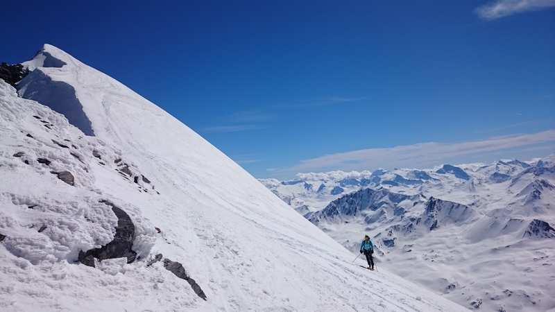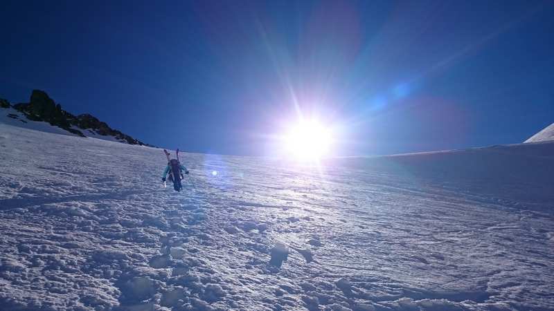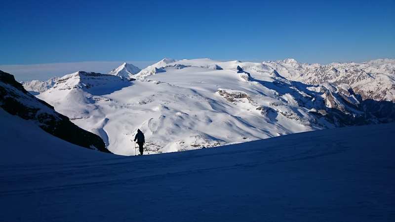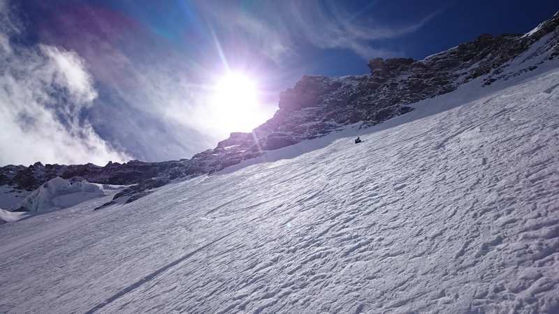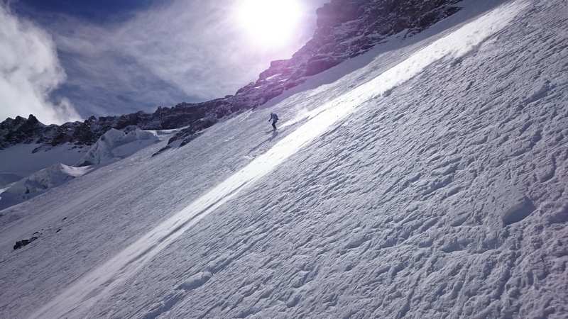 Montés par les grands couloirs à ski jusqu'à la dernière pente avec parfois les couteaux puis en crampons jursqu'au plateau sommital. Avec un vent moyen et un neige dure voire gelée, je n'ai pas trop d'espoirs pour que ca décaille en mi-journée. 3 personnes devant nous descendent par la moyenne face nord qui semble en bonne conditions sauf le haut, c'est donc l'option que nous prenons.