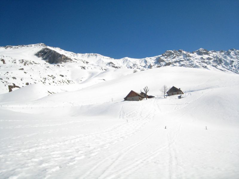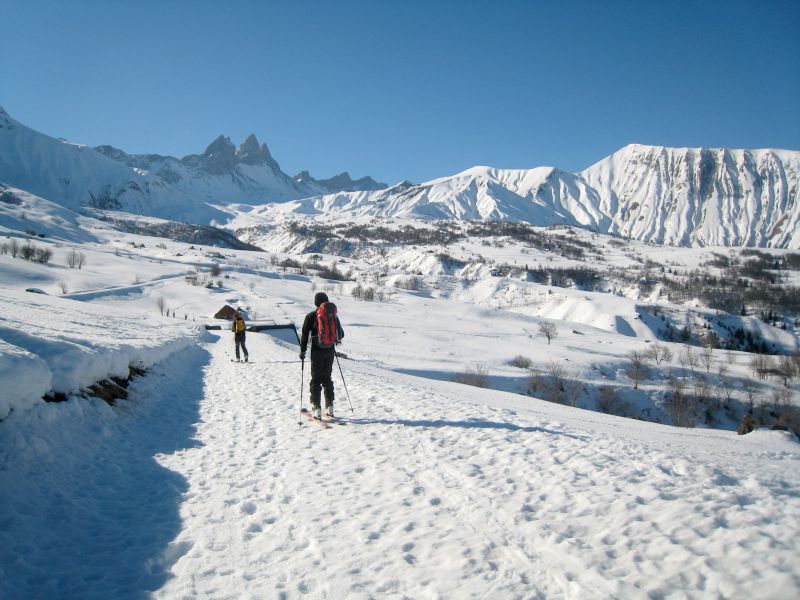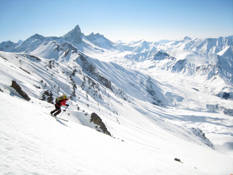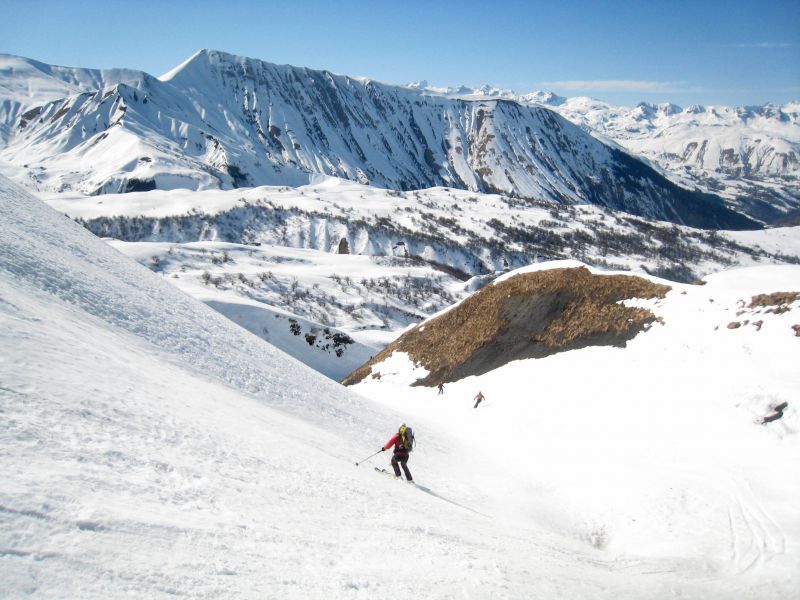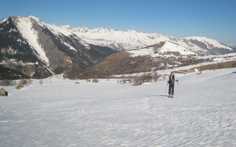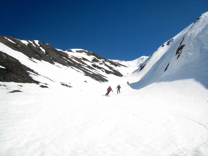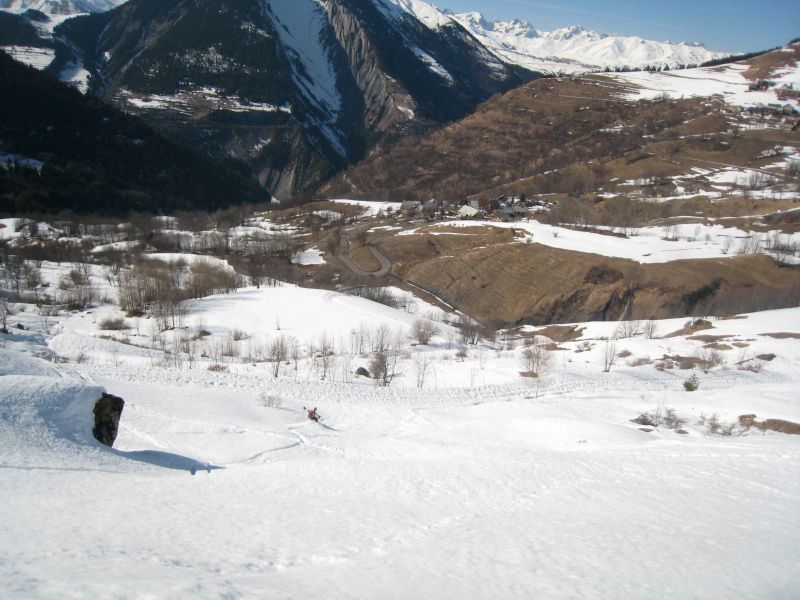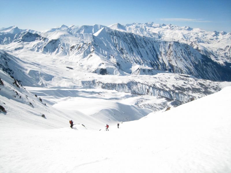 Simple A/R après avoir abandonné l'idée d'aller s'échauffer sur le versant sud-est. Insuffisanement enneigé dans l'axe du sommet, nous sommes sorti par la droite sur l'arête sud. Après la descente de la face, nous avons poursuivi la descente dans l'axe en empruntant une ravine fort ludique. Un petite remontée nous a ramené sur le chemin
