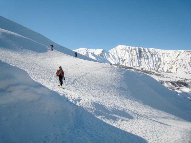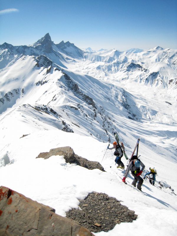 Par ces chaleurs, les versants ouest permettent un reveil à une heure encore raisonnable ! Pas mal de traversée pour aller chercher la face, mais avec la bonne humeur ça passe tout seul, et ça laiesse tout temps pour observer ces reliefs de ravines qu'on ne voit pas trop dans nos massifs Isérois.