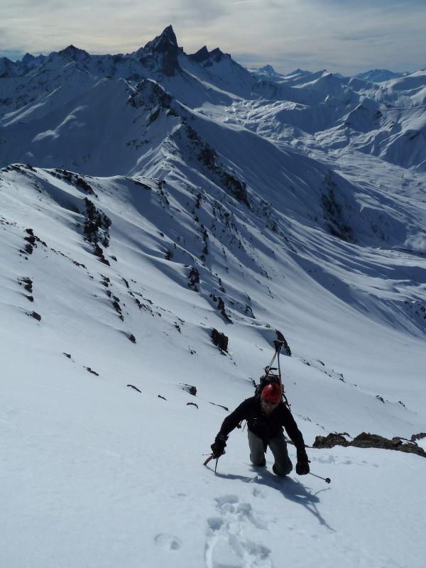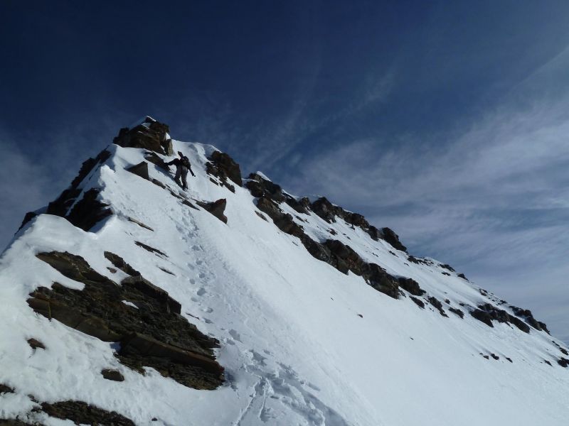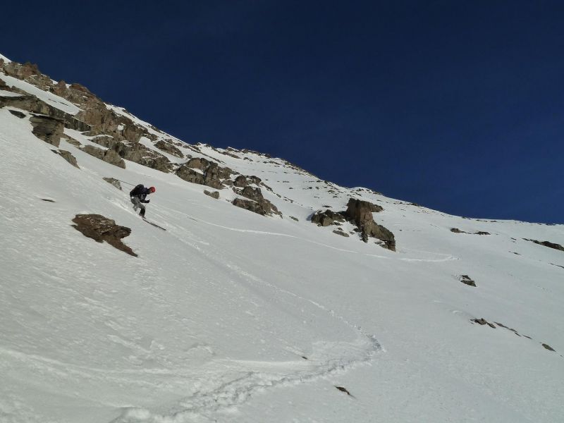 Un peu joueurs sur les prévisions de transformation de la neige en face ouest : l'audace a viré en déconfiture. Dommage car le remplissage est bon. Le ski était vraiment mauvais dans la partie sommitale, puis correct dans les contrepentes mieux exposées, horrible un peu plus bas, étonnament bon pour terminer à plus faible altitude, dans les cristaux déstructurés.