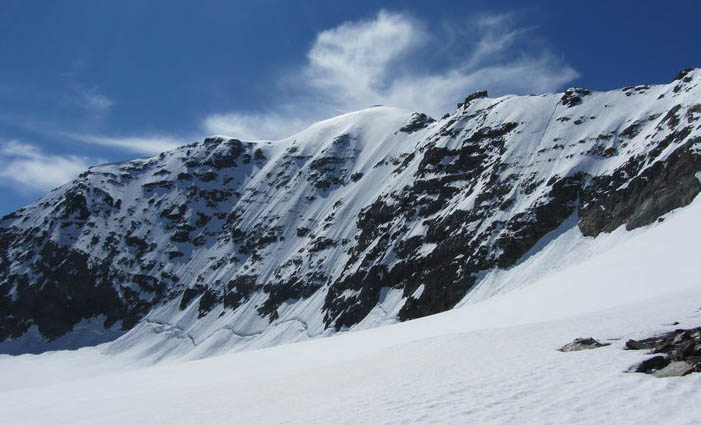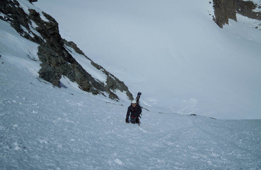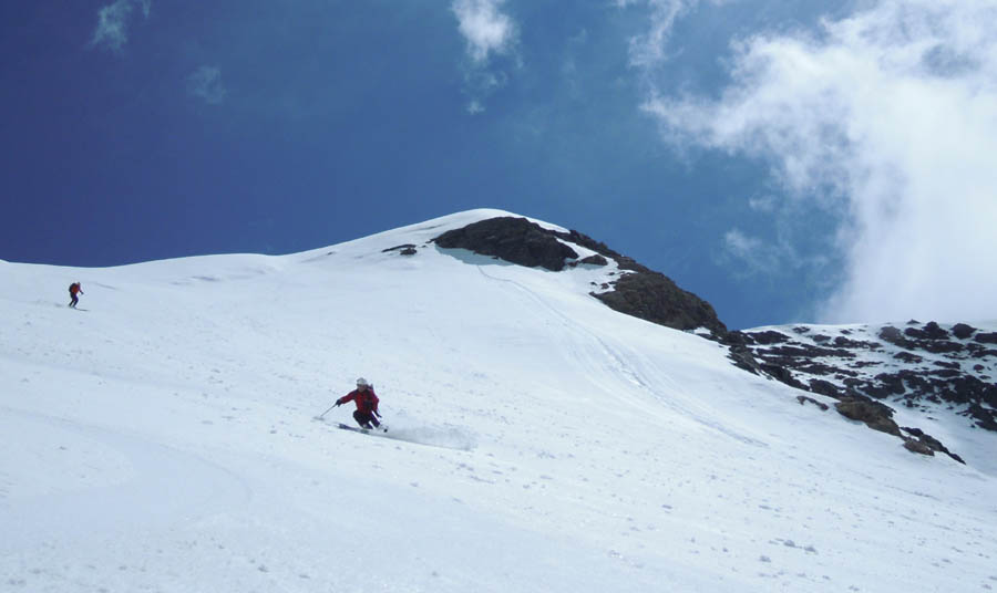 Dès le col Tonini la face N paraît bien sèche en partie basse avec beaucoup de rochers et une goulotte très marquée qui semble interdire une descente dans l'axe. Finalement nous décidons d'aller tout de même voir et après avoir passé la rimaye très à droite nous remontons la face en écharpe vers la gauche. Nous rencontrons une neige très dure voire glacée, lustrée par les purges dans les étroitures inférieures. Sans doute l'effet du coup de chaud + vent de sud de l'avant veille.