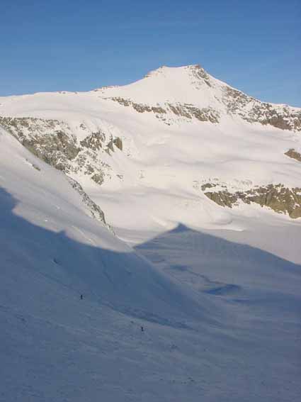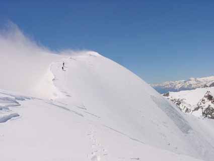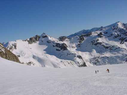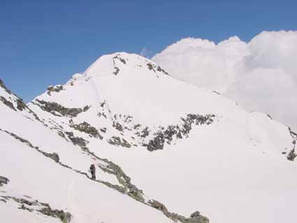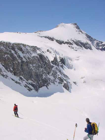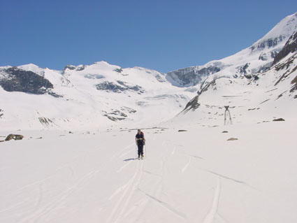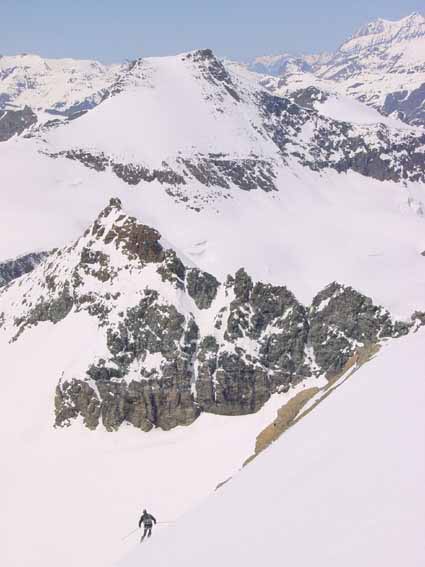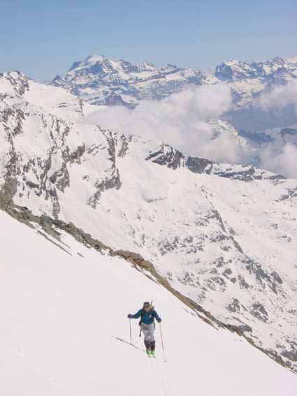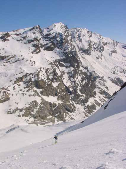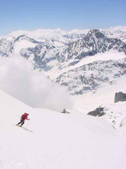 Tour magnifique où on traverse cinq glaciers en jouant à saute-frontières : les bourgennements de la plaine du Pô ne nous ont pas gênés, ils sont restés sagement sur l'Italie tout en léchant les crêtes. Une fin de course quasi à la bagnole en utikisant le torrent le plus à l'est (parfois scabreux, trous en formation).