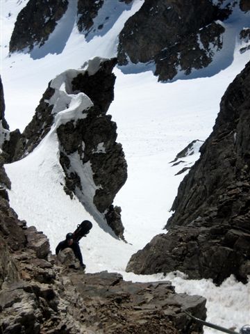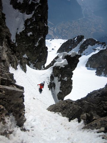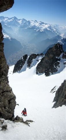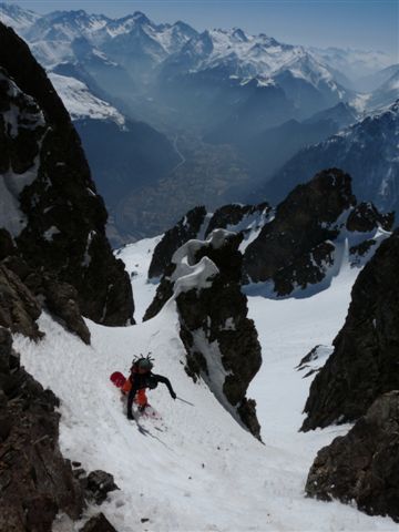 Un beau petit couloir avec une belle ambiance que Joël avait déjà fait en alpinisme en tentant le sommet de la Grande Lance d'Allemont. Il est court mais le haut est très étroit et bien raide (donc assez technique) et la pente reste ensuite soutenue sur environ 200 m. Reste que pour monter au sommet l'arête raide et effilée avec ses piles d'assiètes n'est pas franchement acceuillante !