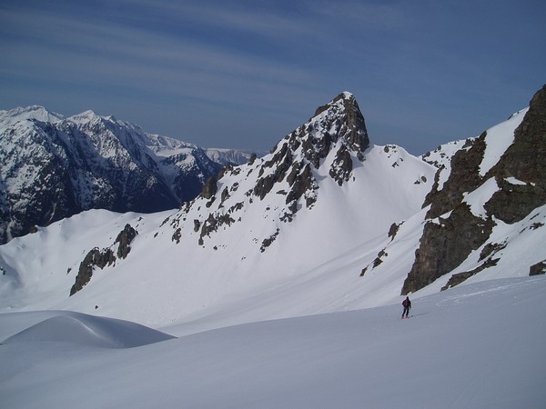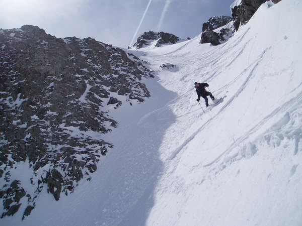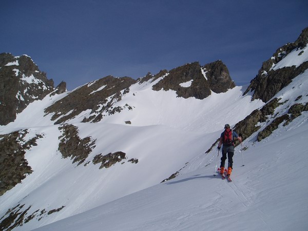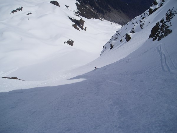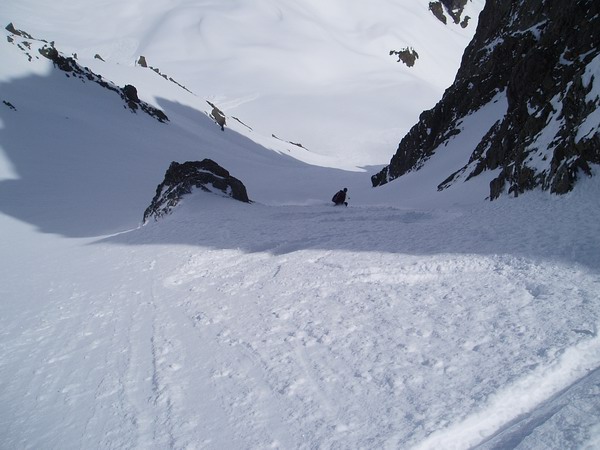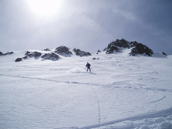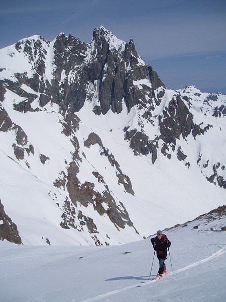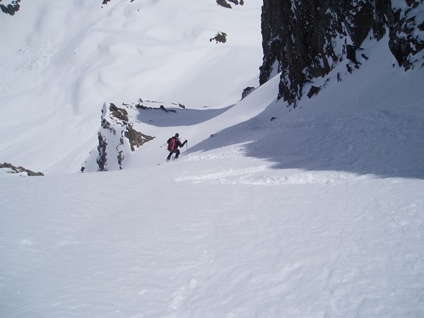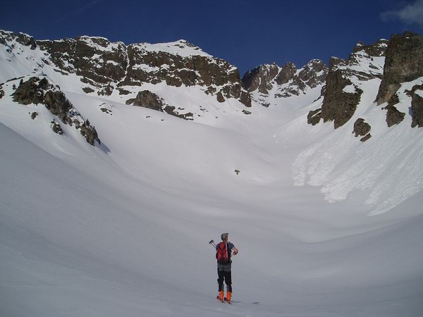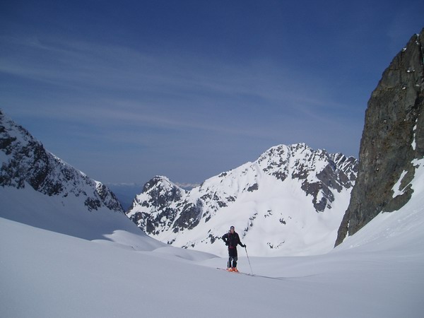 Très beau tour qui permet de visiter des vallons de Belledonne peu fréquentés. Conditions optimales ce jour, montées et premières descentes faciles en neige dure puis plus de 600 m de poudre vierge pour terminer. Simon enchaîne son plus gros dénivelé (environ 2000) et son premier vrai couloir en très bonnes conditions. Personne n'était venu semble-t-il dans le secteur depuis les dernières chutes de neige.