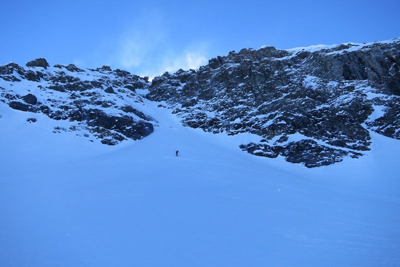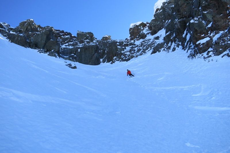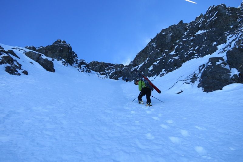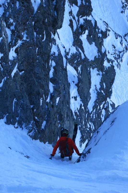 Conditions sans doute assez optimales pour visiter cette face, avec une neige bien lisse et dense juste comme il faut. Pour autant l'ultime pente est bien expo, Yann et moi avons choisi de chausser sous le crux alors que Cyril a tout passer à ski. En tout cas c'était à coup sûr bien meilleur que le versant sud bien croûté.