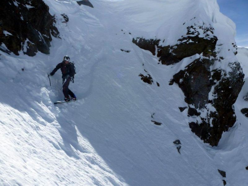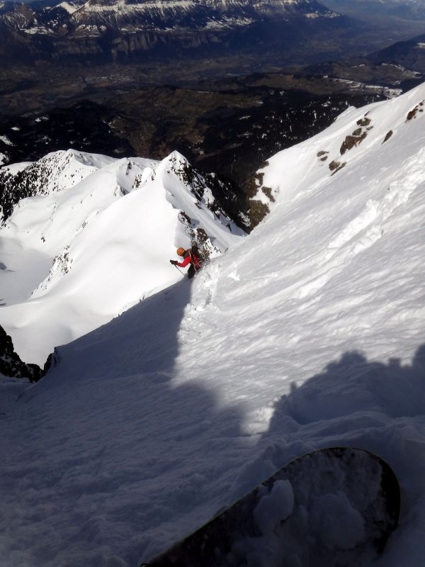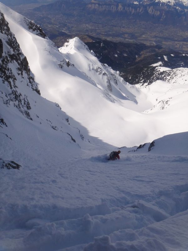 Très bonnes conditions dans cette face ce jour. Joël est entré direct depuis le sommet moyennant quelques escaliers. Le surf n'étant pas l'engin idéal pour faire des escalier je suis entré de l'autre côté : presque pas de corniche, ça passe sans bricoler. Un tout droit accompagné d'un petit saut nous a permis de passer proprement le premier ressaut. A partir de là c'était grosse poudre. La chatière fait 1.6 m de large, c'est passé surf au pied mais pas en tout droit. Hélas 16 cm de trop sur les skis de Joël, seul MLF serait passé avec deux lattes aux pieds ;-). Puis re-grosse poudre, un régal.