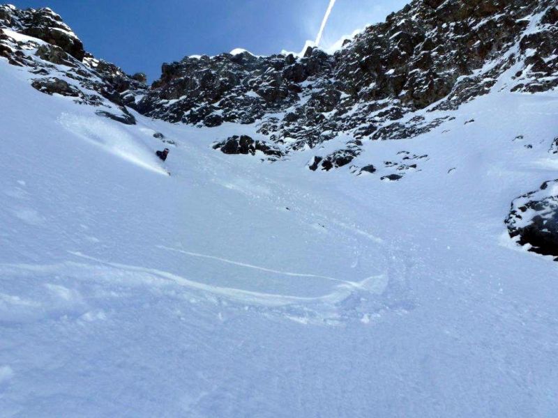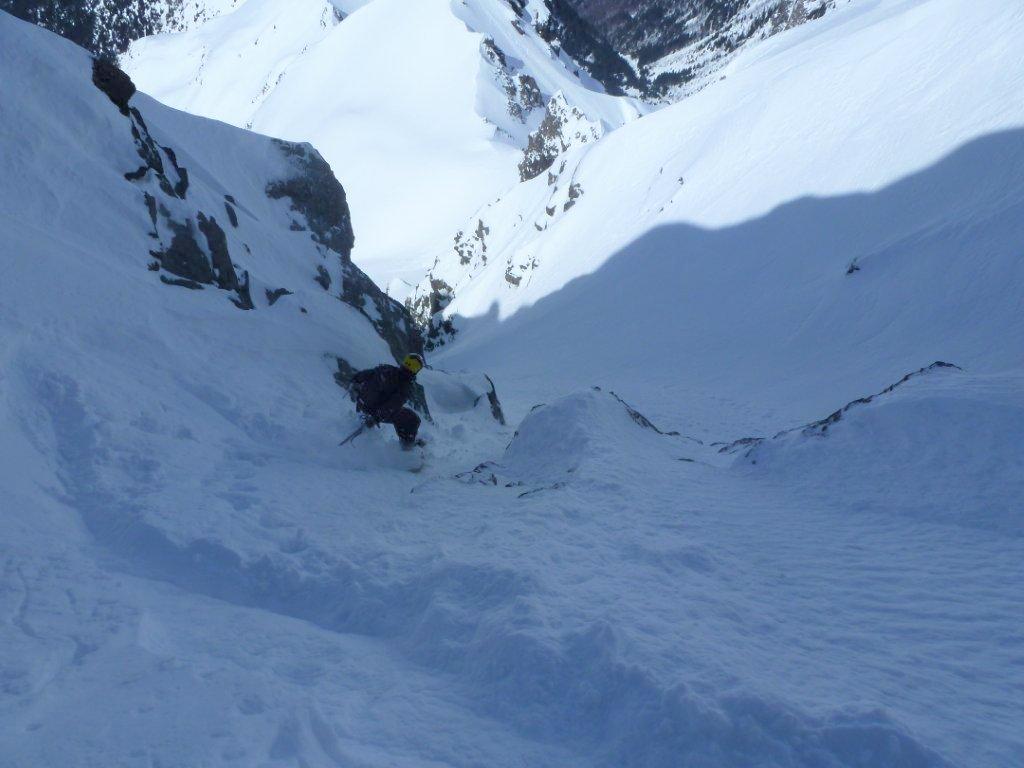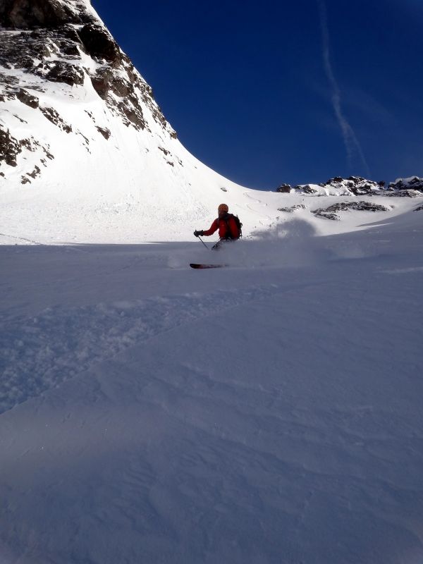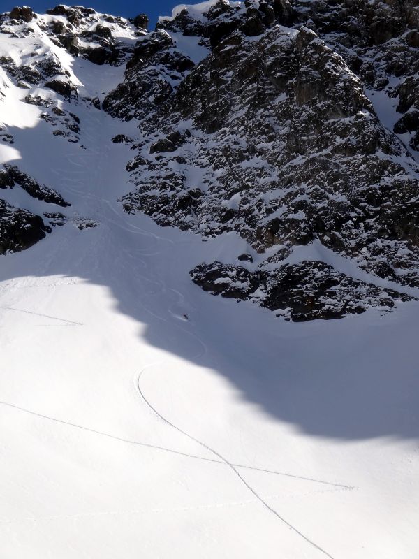 En versant sud du col du Loup, la poudre a bien chauffée et part sous les skis dès que c'est un peu raide. Quelques belles coulées en allant taquiner les pentes en rive droite, sinon pas de souci en rive gauche.