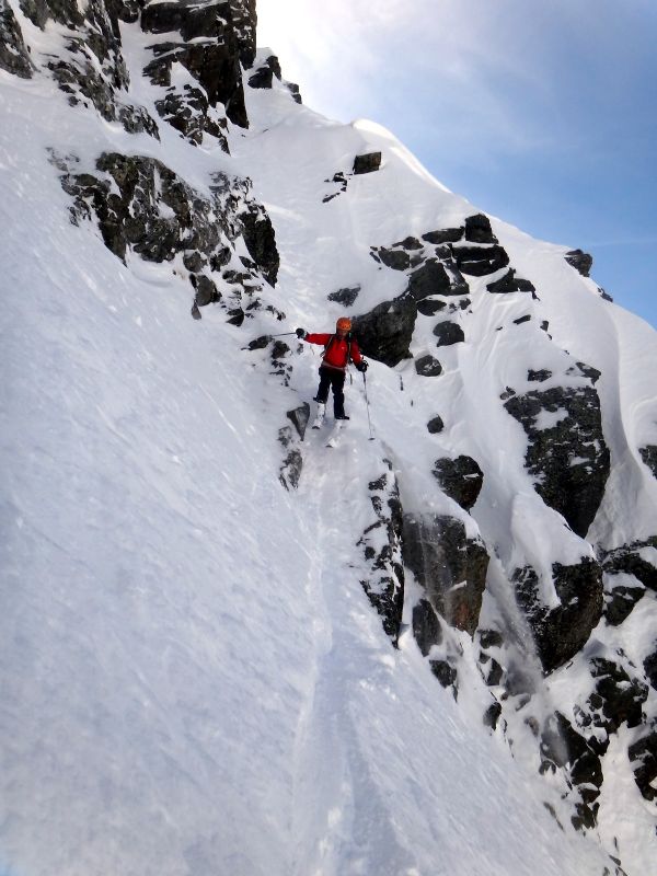Dans la face pas mal de spindriffs dans la face en montant, presque plus lors de la descente. Bonne poudre homogène dans les 2/3 de la face inférieure. C'est plus variable dans le 1/3 sup : présence de sucre près de rochers, poudre dense sur fond dur accrocheur ou même encore grosse poudre. Toujours bon à skier/surfer.