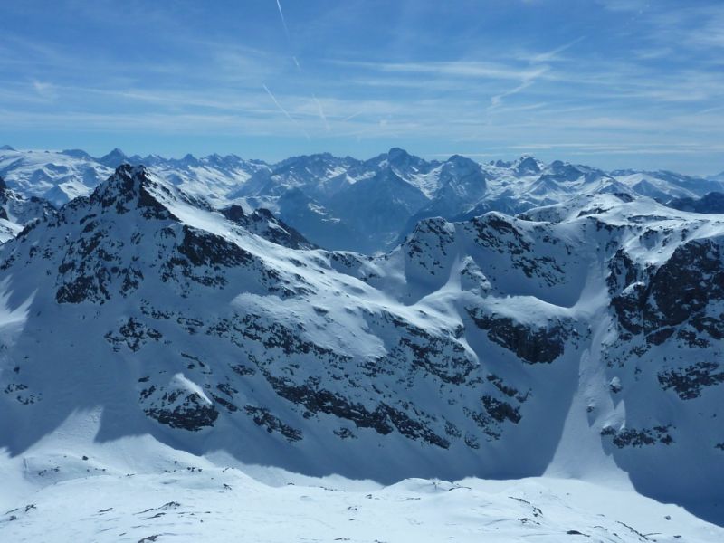 C'est le printemps ou presque ! ça chauffe vite; Je pensais que la descente par B13 (à 12h) serait de meilleure qualité. Sur toutes les orientation chaudes parcourues la neige n'est pas encore bien transformée - place à une neige chaude épaisse pas des plus skiante. Sinon les faces N comme celles du Domènon et Lauzière ont subi les assauts du vent, elles ne sont pas belles à voir. Face No du Grand Colon bien abîmé également.