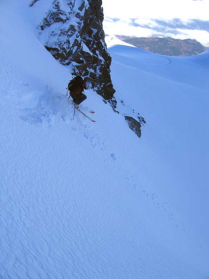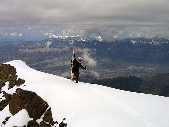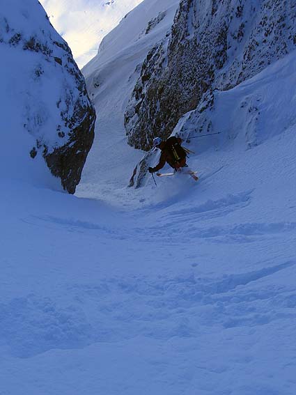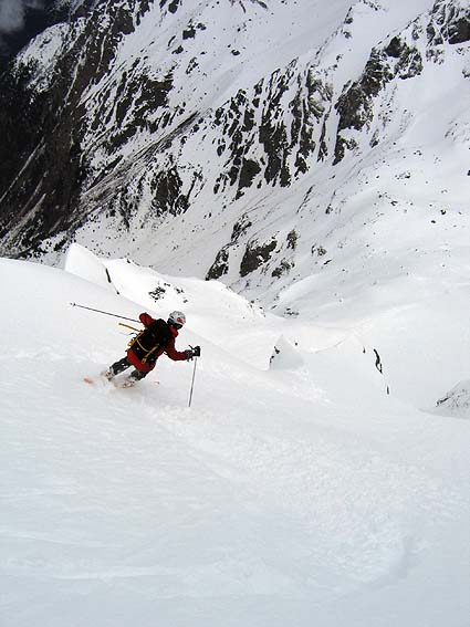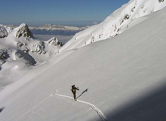 Ras le bol de ces conditions météo ! Aussi, pour cette journée de beau temps nous avions décidé de nous rassasier. On n'a pas été déçu. Les versants nord sont en bonnes conditions. D'abord le Couttet : un bien beau couloir. L'étroiture passe facilement moyennant 5m de dérapage. Ensuite la Grande Lance. Voyant la nord-est bien remplie, on l'a faite en aller-retour. calvaire à la montée (1h30 à pied, enfoncement maximum jusqu'à la taille en cassant la (toute petite) croûte de pluie à 40cm sous la poudre). Le très bon remplissage de la face n'a cependant pas évité 10m de déchaussage pour raccorder les deux rideaux supérieurs (quelle exposition !). Enfin, on n'a fini au pic du Loup par la face sud normale, non sans avoir buté sur un 3è projet de pente raide où la neige partait en plaques chaudes sous les skis en raison du réchauffement. Une bonne manière de rentabiliser le déplacement.