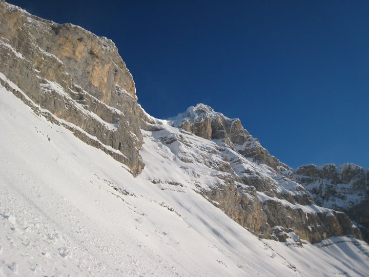 C'est vraiment très raide sous la corniche, ça se couche ensuite progressivement, la sortie au sommet est également assez raide.