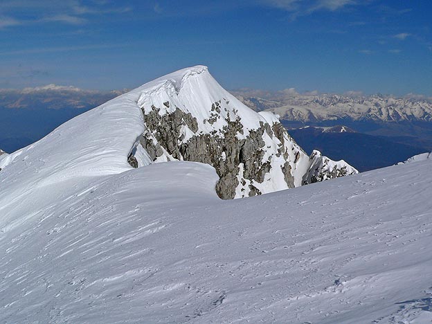 C'est K13.1 depuis Corrençon station avec une variante à la descente : l'arête terminale (200 m de déniv quand même) entre le haut du couloir et le sommet étant assez soufflée, j'ai trouvé à vue un passage en face nord qui lui est parallèle et qui permet de skier sans toucher le moindre caillou. Ce passage est raide sur 100 m, majorant sans doute la difficulté de l'ensemble, d'autant que l'exposition est non seulement maximale, mais qu'en plus on s'en rend bien compte en étant parfois pas très loin du bord. Ambiance extrême.