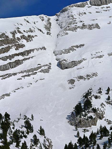 Conditions au top : transfo en bas (parfaite à 17h vu les températures), partie nord en grain fin ultra tendre (la plus faciles des neiges à skier qui soit), seulement 50 m en haut du couloir en neige collante en cours de transfo, pas de portage (la limite basse devrait cependant remonter assez vite vers 1400 où il y a un bon stock). A titre d'exemple, en ce qui concerne les limites ski, on est grosso modo au même niveau que 2005 (probablement l'hiver le plus arrosé dans le Vercors depuis 20 ans) et un poil mieux que 2006 (probablement un des hivers les plus froids depuis 20 ans) et ce malgré un hiver 2008 qui devrait battre des records de chaleur. Comme quoi, le cumul de neige ne fait pas tout ; une bonne répartition des chutes tout au long de l"hiver et l'absence de canicule juste après une chute sont des éléments déterminants.