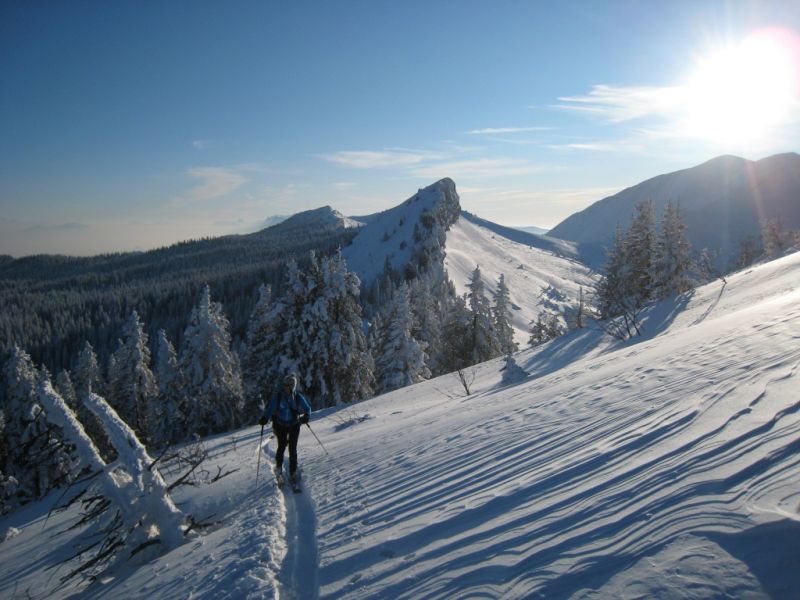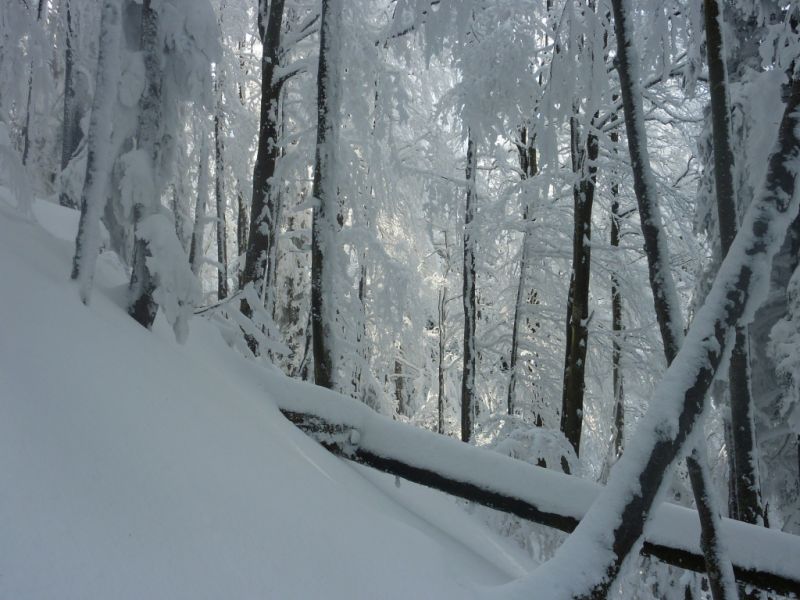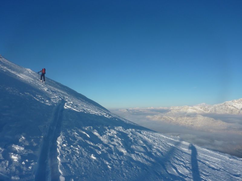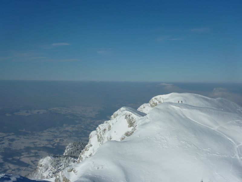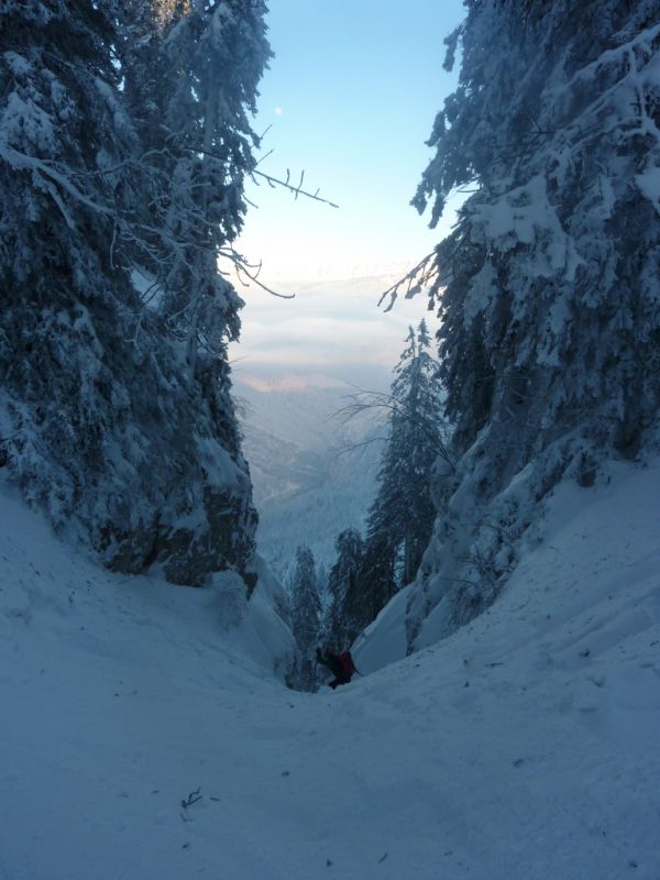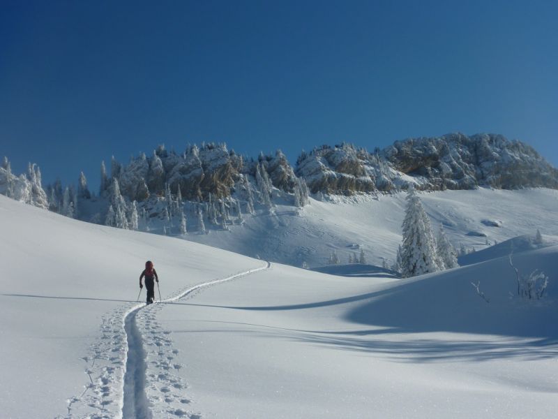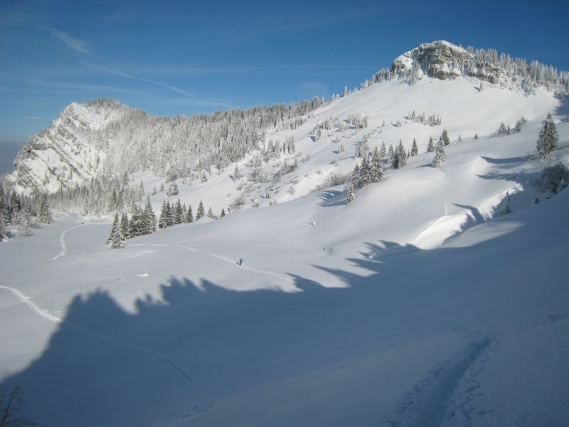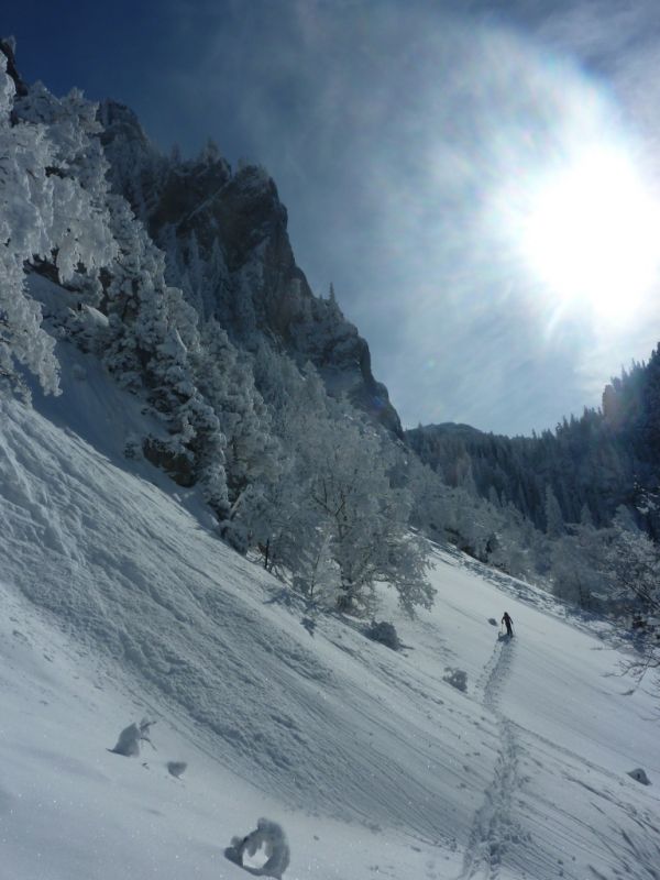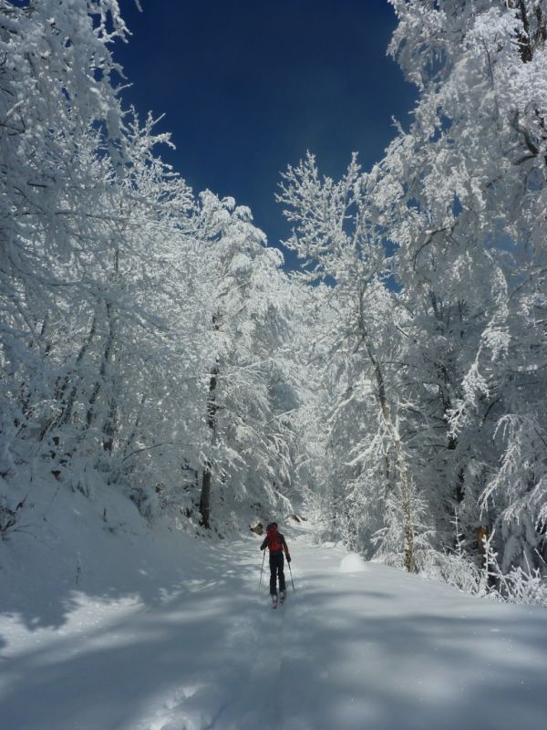 Une très belle balade - longue jusqu'au {{cul de la Lampe}} et variée avec du plat, un peu de pente, un bout de couloir, de la place sous le pas de la Biche, de la forêt, des belles zones dégagées et une vue à 360° sur les plaines enneigées, jusqu'au Mont-Blanc. Et comme partout en forêt en ce moment, on en prend plein les mirettes des arbres chargés ras la gueule de neige. La fin de notre sortie a été cependant un peu entachée d'une bonne partie de galère en forêt. Oubliant que l'enneigement n'est, en partie, qu'apparent sous 1200m environ, au lieu d'emprunter tranquillement la piste forestière pour le retour, on a poursuivi en forêt. J'ai fini en ski dry sur un revêtement raide de cailloux et de glace et Loïsyann en crampons pour épargner ses skis neufs! Un conseil : prendre la piste!
