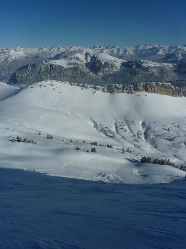 Situation contrastée ce jour: de la poudre légère en forêt, de la neige béton à partir du col de la Sure, des zones plaquées (et parties) en face est mais il reste sans doute encore des zones prêtes à partir.