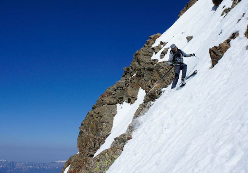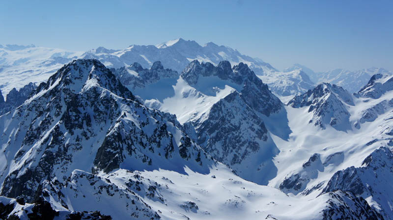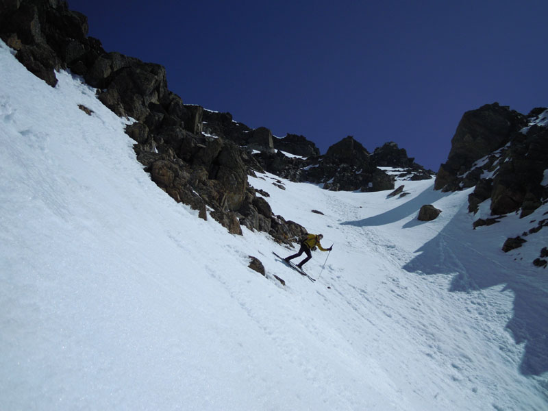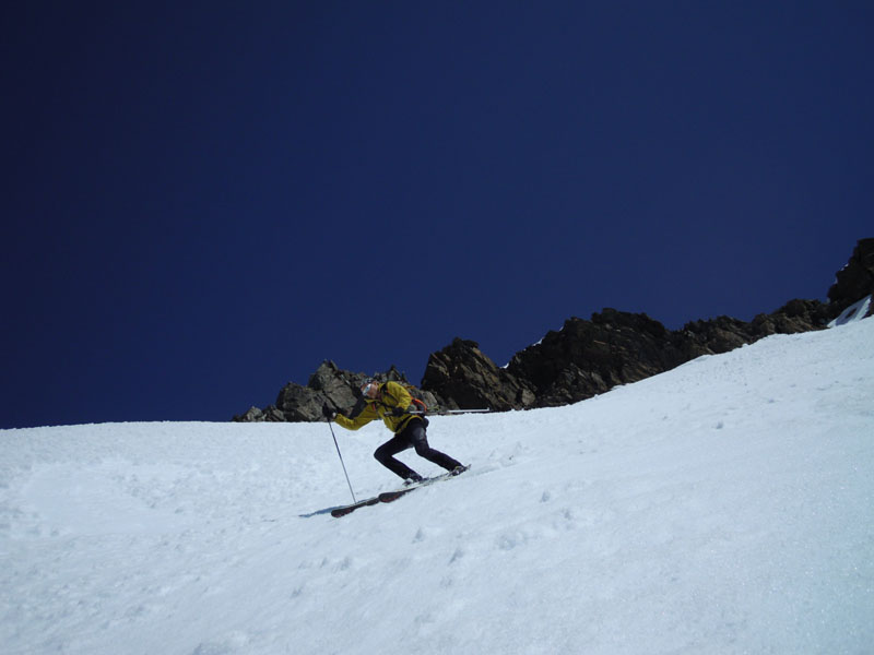 Excellent ski avec une moquette parfaite dans les faces ouest. Départ du sommet 12h45, le couloir juste décaillé en RD, passe sans bricoler mais est assez peu rempli.