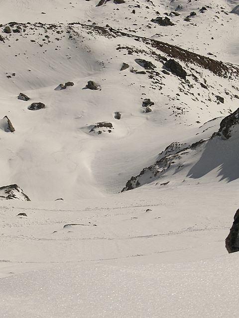 4.1 qu'il dit le Topo !! Surement pas dans les conditions du jour (heure). Une put... d'expo en haut du couloir, c'est quasi béton + les caillasses au départ. Adrénaline et kequette !! ... j'vous dis. Heureusement deuxième partie revenue. Relache totale au bas de la GM d'Arvillard, version free ride à mach 2... ça fait du bien. En attendant la neige ... enfin ...