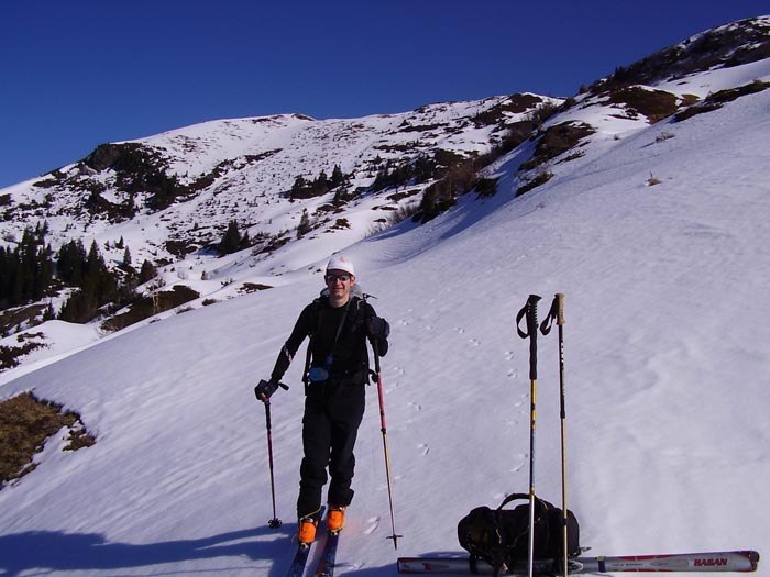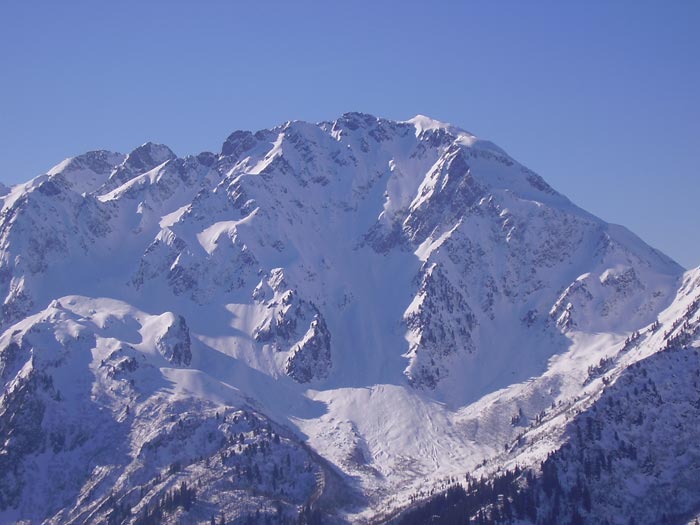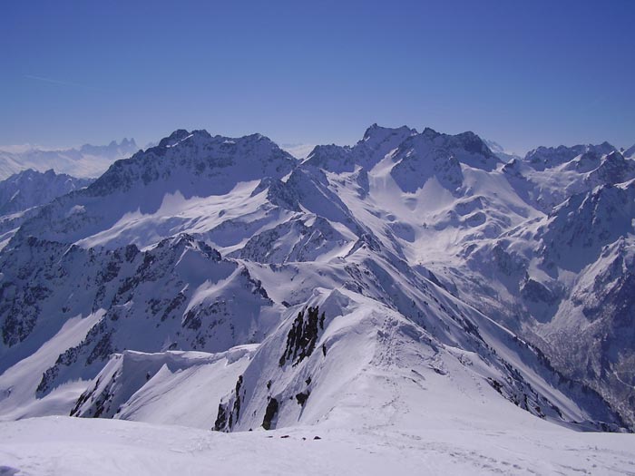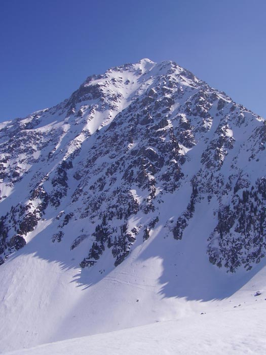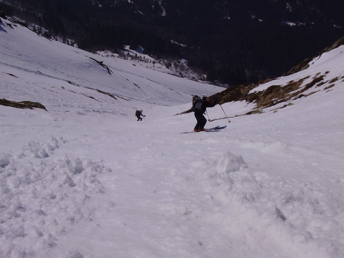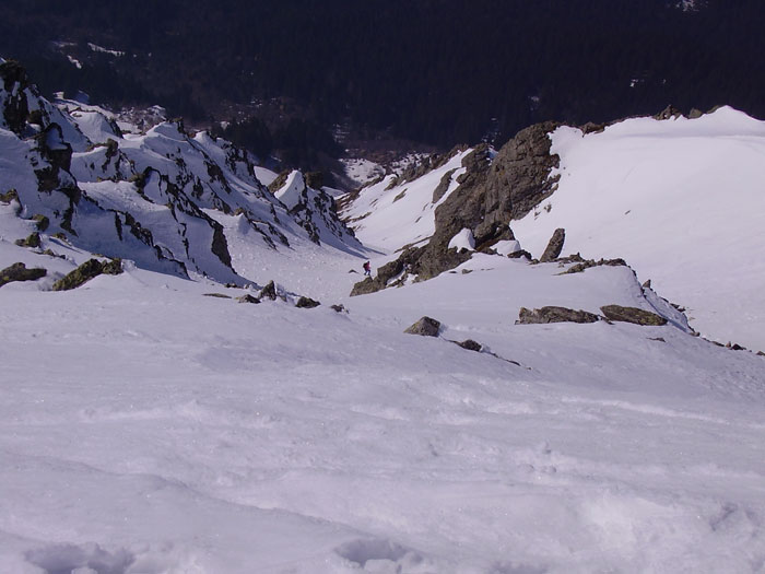 On peut placer cette course dans le top 50 : la longueur de l'accès nous vaut sans doute une certaine tranquillité (8 skieurs au sommet, 7 dans le couloir SO) un si beau vendredi. Le secteur est sauvage et l'itinéraire est varié à souhait. Nous étions une heure trop tard dans la face sud, un peu molle. Par contre, le couloir était à point, avec un petit passage encore un peu dur juste sous le sommet (un skieur avant nous a failli se faire surprendre) et des contre-pentes un peu plus raides mais excellentes. Le fond est un peu envahi par des boules, mais on peut quand même y poser des virages. La nord-est a été descendue ce jour en aller-retour. Le couloir nord-ouest également, mais c'est plus ancien. Plus à l'ouest, un autre couloir sortant sur l'arête NO vers 2200 a aussi été descendu. Le couloir E est bien tracé, mais il était trop tard pour le descendre.