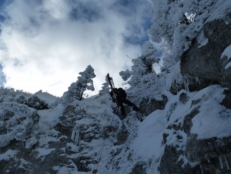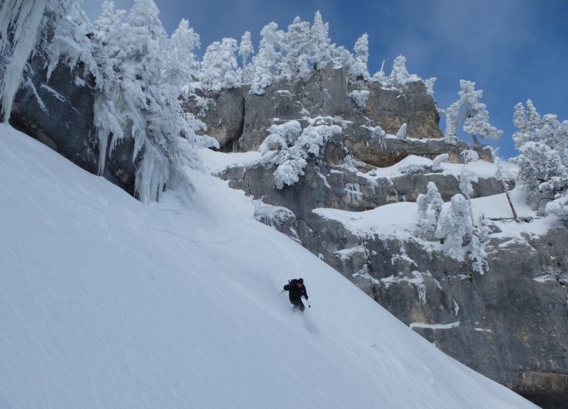 Nécessite tout de même un bon remplissage pour bien lisser les ressauts supérieurs, et une nivo stable car l'itinéraire emprunte des pentes larges et suspendues au dessus de barres rocheuses.