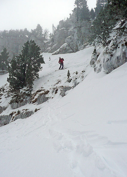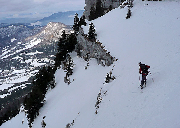 Conditions de ski assez bonnes mais il faut considérer qu'il n'y a plus de vraie poudre sous 2000 m avec ce petit coup de redoux et ce couvercle nuageux ayant "maté" la neige. L'itinéraire est astucieux et pas bien difficile quand le remplissage est correct (40° max, un petit saut sans histoires). Difficile de comparer tant nous avions eu l'an dernier des conditions de cinéma une fin d'après-midi d'hiver dans la voie voisine de la balme à Colon mais cette dernière reste à mon avis la plus belle du Granier car plus dérobée et plus variée. Tiercé dans l'ordre : 1- balme à Colon, 2- Porte, 3- Tencovaz