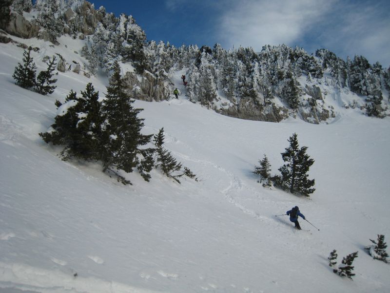 Neige poudreuse en foret , dans le couloir et en dessus, alternance de petites plaques friables20/30cm et neige poudreuse en cours d'humidification. Neige difficile à skier en haut foret de fayards excellente.