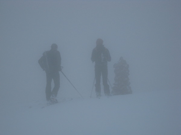 Un joli itinéraire et du bon ski ce jour malgré les nuages qui allaient et venaient pour finalement ne pas se dissiper au coucher de soleil...Méfiance toutefois avec ces plaques friables très fragiles et sans aucune cohésion avec le fond dur. Celles ci n'étaient pas assez épaisses pour recouvrir quelqu'un mais pouvaient déséquilibrer et entrainer le skieur inattentif (pas conseillé au dessus des barres...)