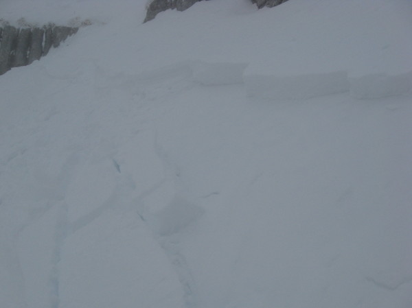 Petite chute de la nuit: 15cm en moyenne, qui a du être +/- ventée pendant la chute: irrégularité entre les combes et les bosses. Dans les barres, on trouve des accumulations plus importantes , jusqu'à 40cm par endroits. Très mauvaise accroche entre la fraiche type plaque friable d'apparence poudreuse et le fond dur=> a la descente nous en avons déclenché plusieurs: l'itinéraire est désormais nettoyé. Les deux dernières déclenchées en haut du couloir de droite (vu du bas) avaient un peu plus d'ampleur (environ 40cm au plus épais et 30-40m de large). Bref c'était bien miné mais en prenant soin de déclencher en préventif en se protégeant ca passait. Bonne stabilité dans les pentes d'accès: la pente n'est pas assez raide pour que ça parte.