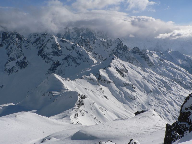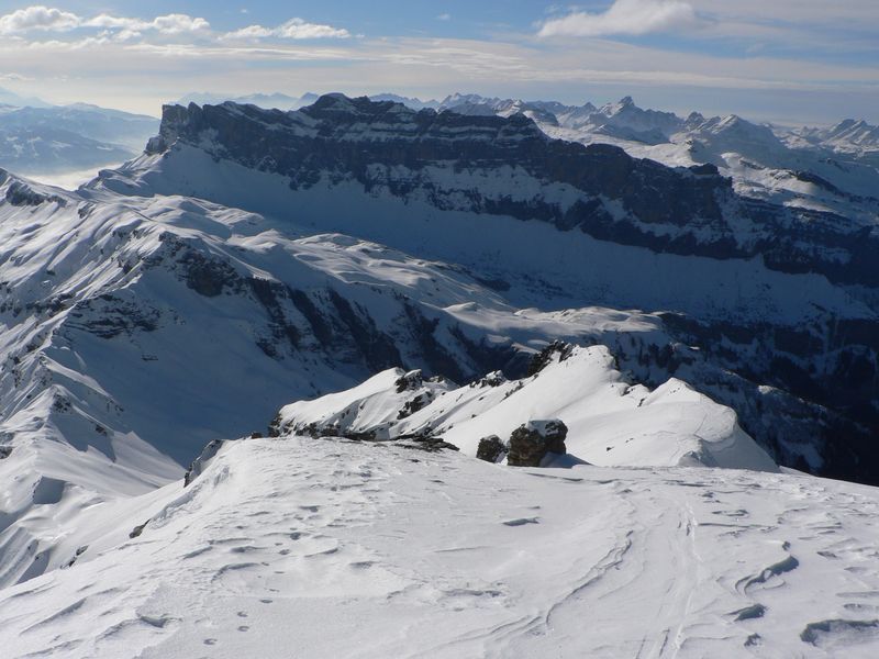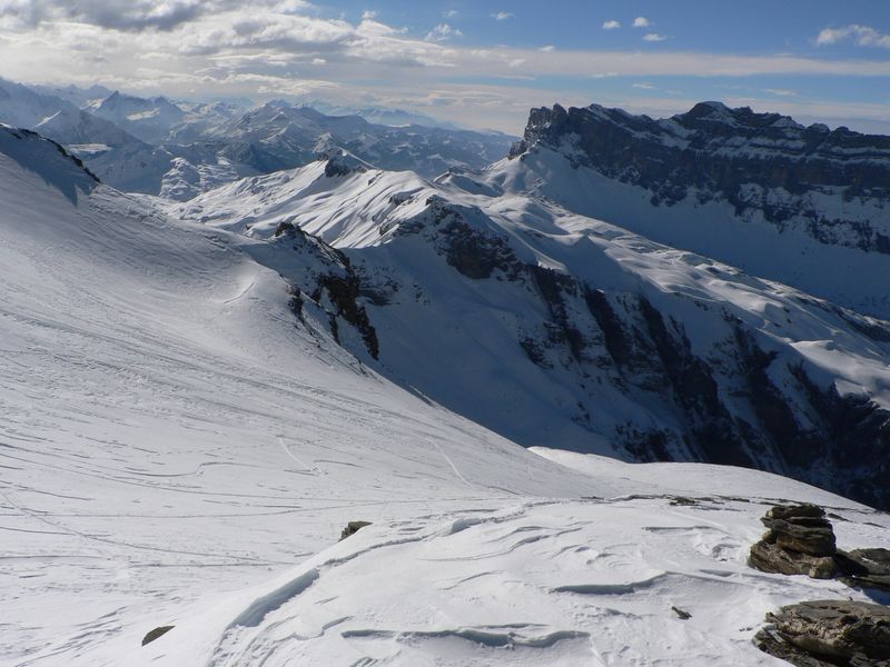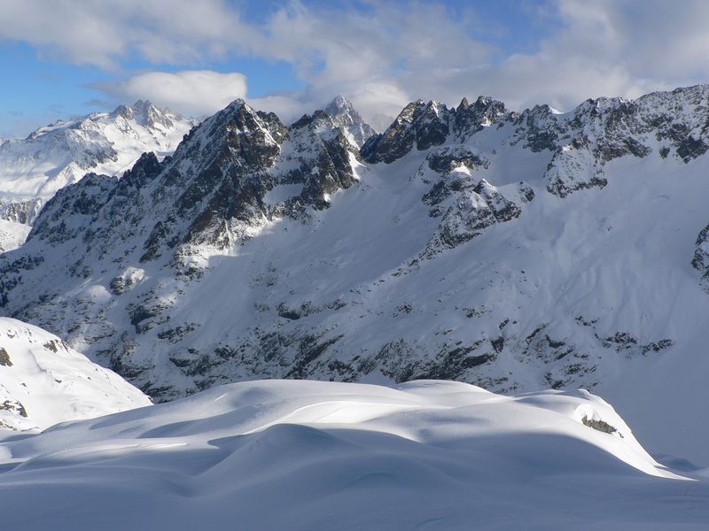Descente sur le pont d'Arlevé (assez tracée) : un peu de poudre, puis coutée puis dure. Vallon de la Diosaz jusqu'au col des Chaux (aucune trace entre les chalets de Villy et le col) : croutée puis tranfo sous le col. Descente du Buet (très tracée) : un peu de poudre puis croute puis dure pistée sous le refuge et enfin dure gelée dans le bas et dans les dépots des coulées.