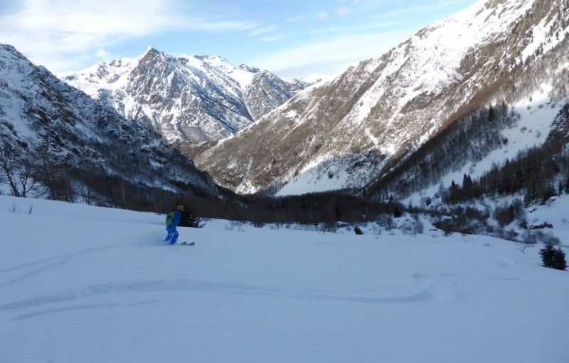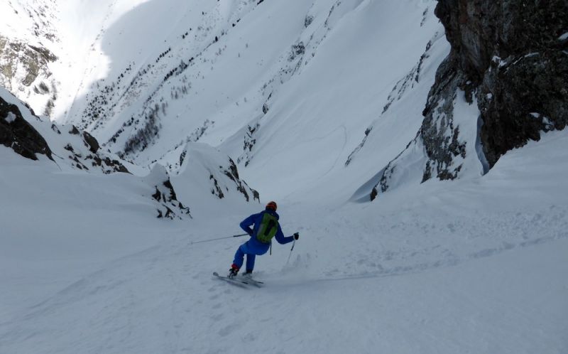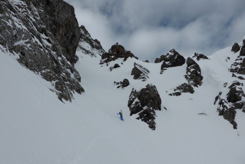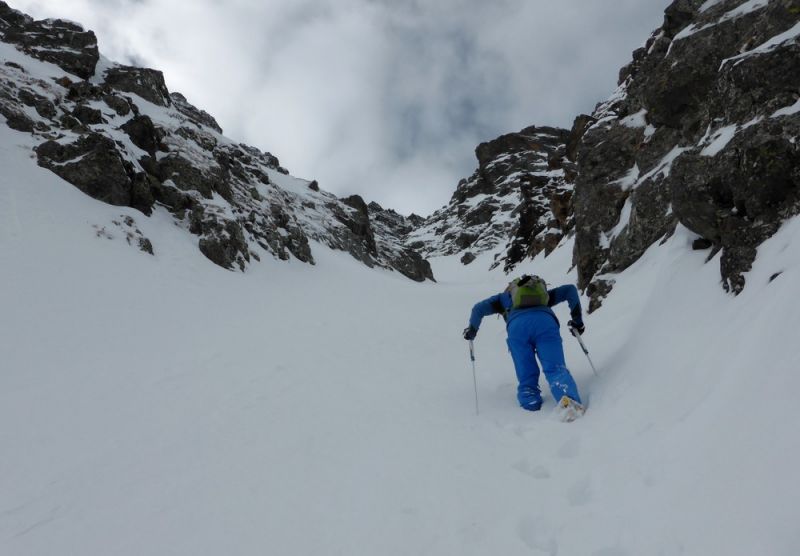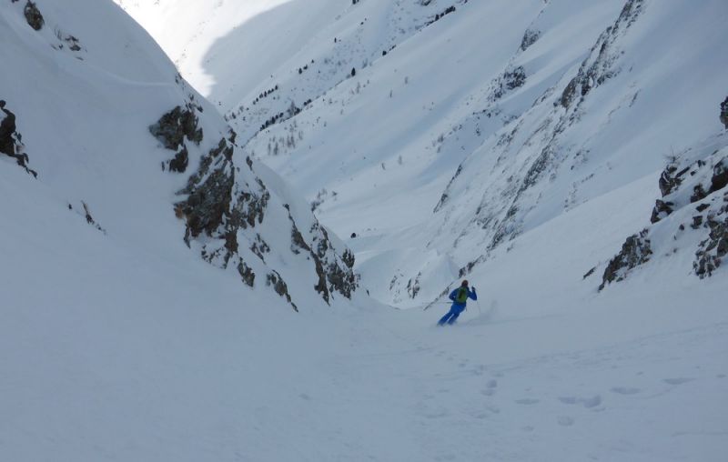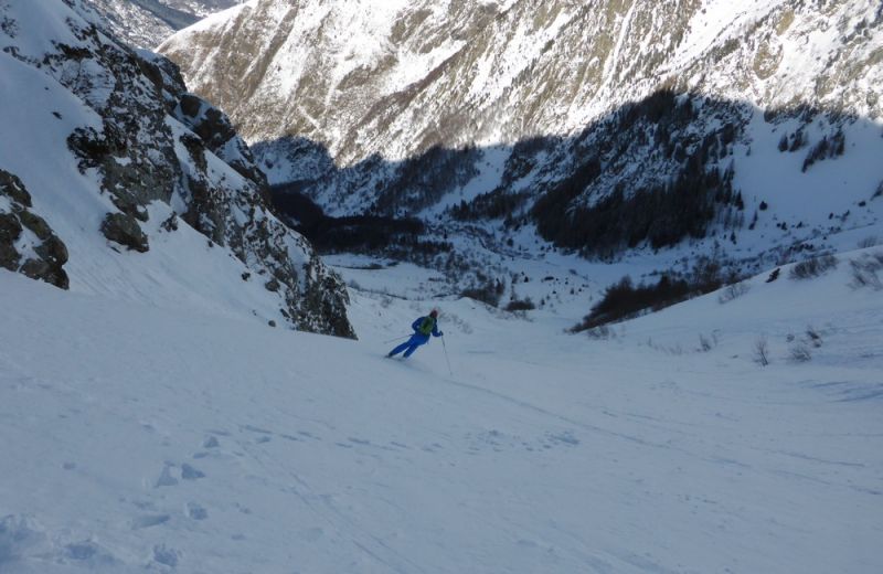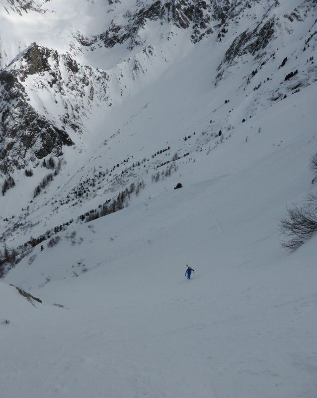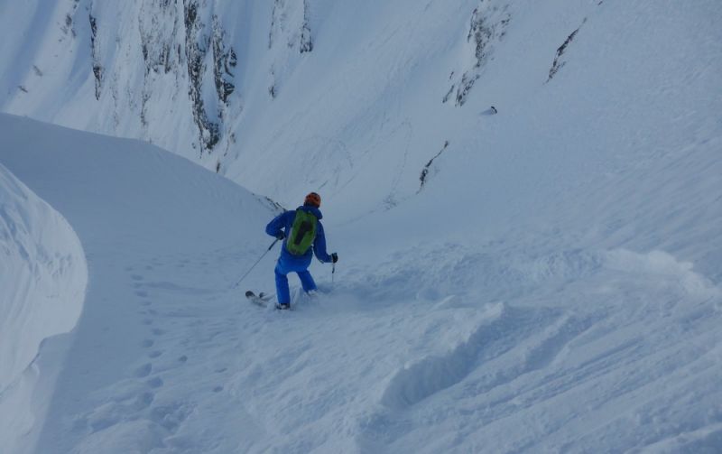 La meilleure neige était dans le vallon d'accès où jusqu'à 1800 on trouvait de la poudre légère sur un fond dure. Dans le couloir si l'enfoncement était conséquent à pied à la descente c'était principalement poudre tassée, parfois un peu de poudre, parfois légèrement cartonnée.