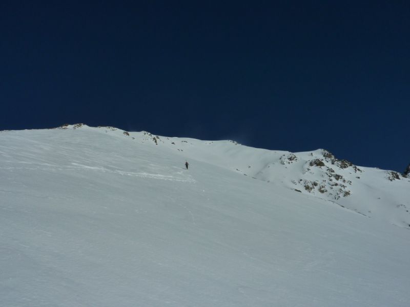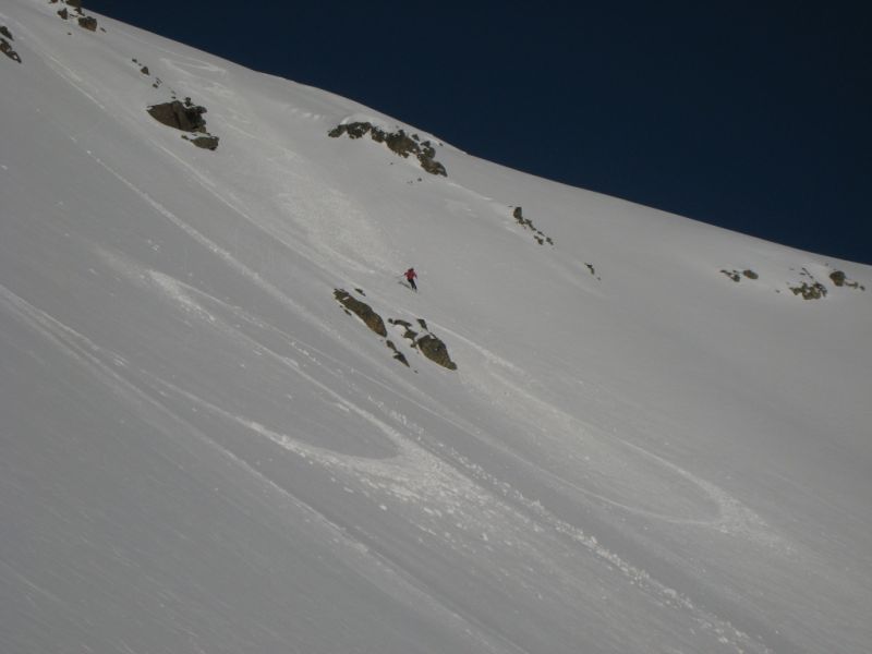 de la neige ramenée dans la pente directe sous le sommet où l'épaisseur atteint une 20aine de cm de neige dense, agréable à skier, sur fond dur. neige variable ensuite dans les grandes pentes, croute de regel revenu ou neige tassée sur fond dur au choix. plus bas, la croute de regel intenable le "matin" était heureusement revenue.